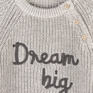 100% organic cotton sweater knit raglan sleeve baby pullover, featuring Dream Big embroidery in the front.