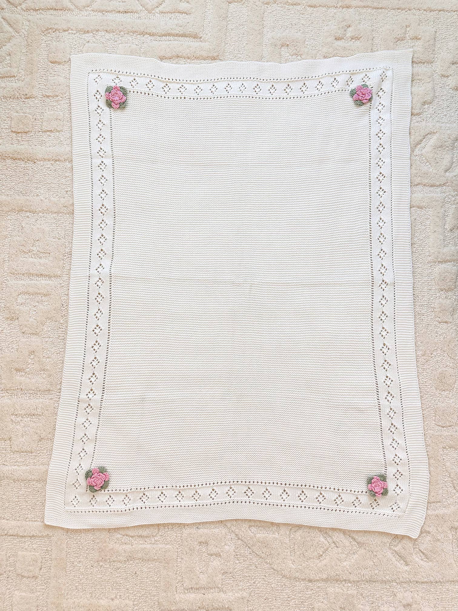Luxurious 100% Organic Cotton Pointelle Knit Baby Gift Set includes: - Pointelle Baby Blanket with flower embroidery (size - 32"x40”) - Flower Knit Baby Rattle Toy 8x8"