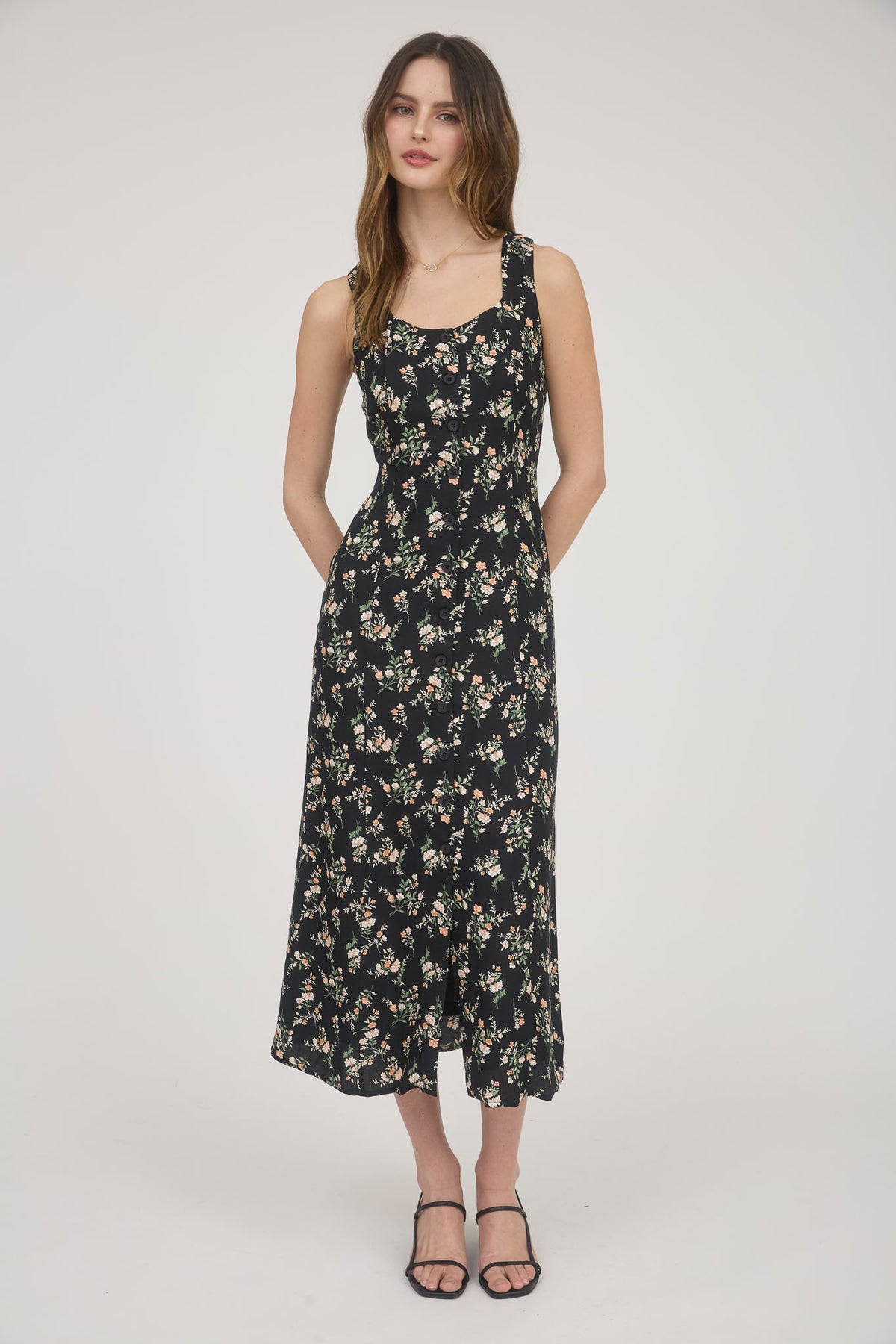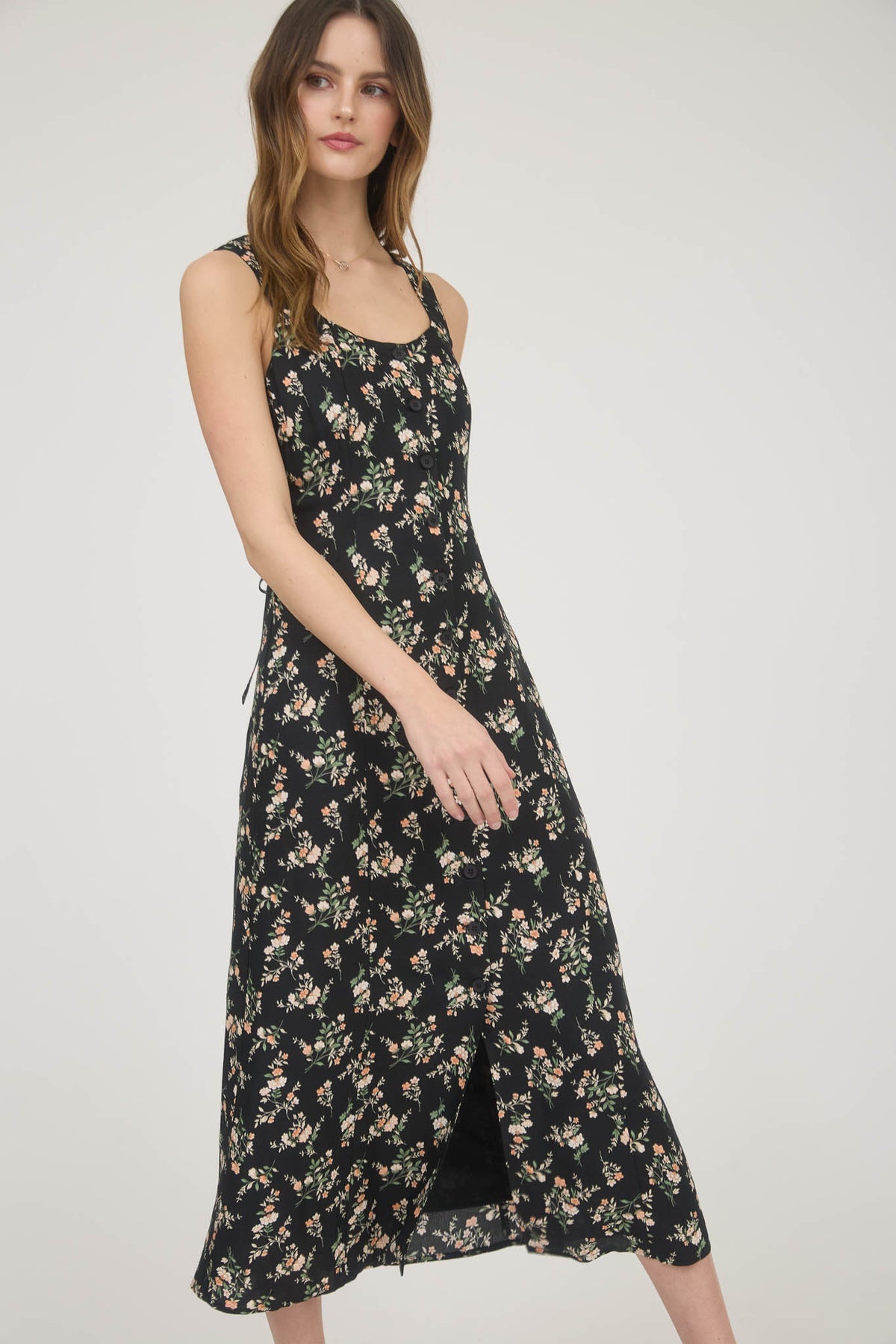 Step into sunshine with the Bethany Button Down Midi Dress, featuring a charming floral tie-back detail that adds a flirty twist to your look. Its breezy midi length and button-down front make it perfect for twirling through warm days or casual outings.