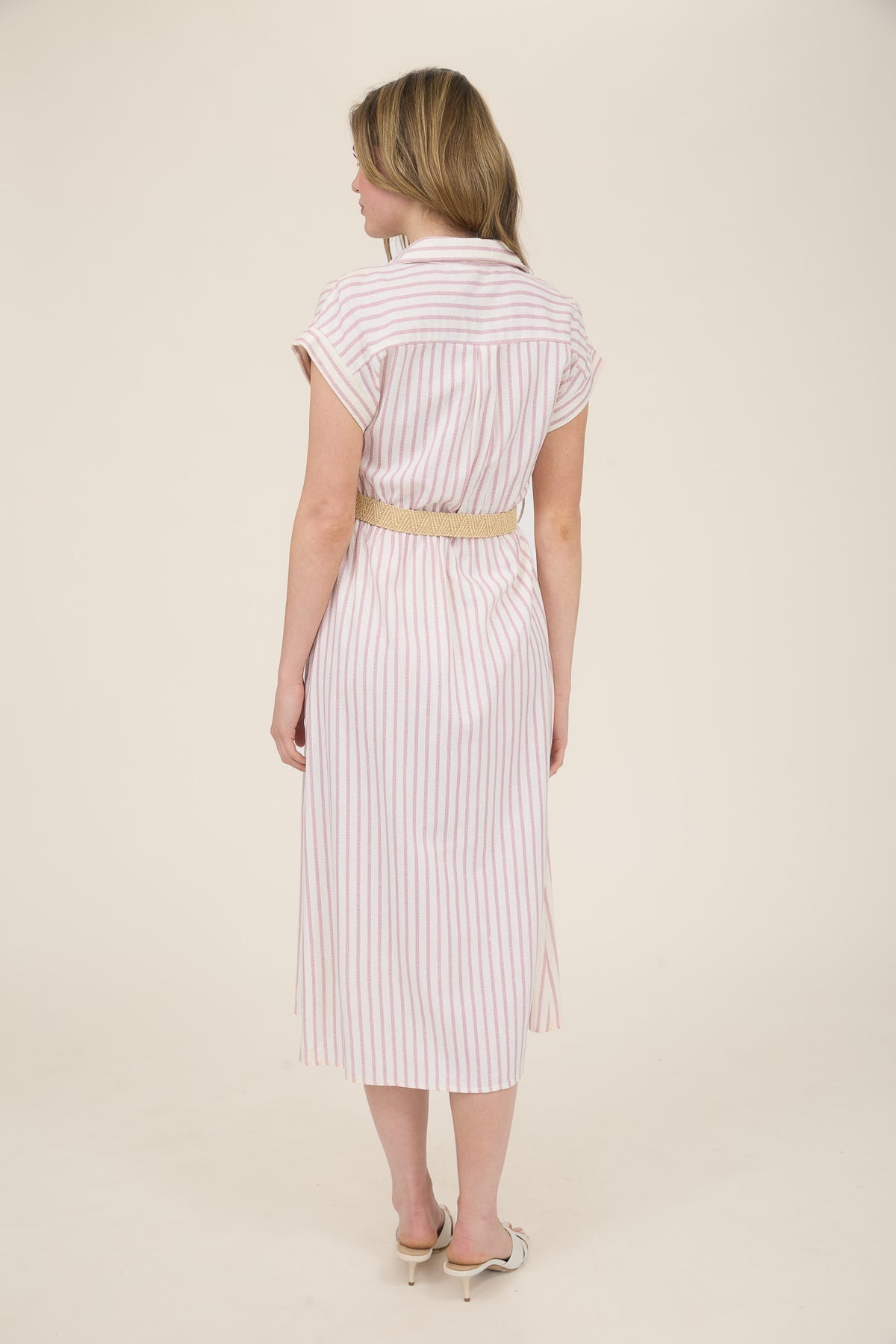 Meet the Lindsay Belted Midi Dress—a fun twist on classic style! This collared, short-sleeve dress features extended sleeves with functional buttons and a flattering belted waist with belt loops. The striped pattern adds a playful vibe, while pockets keep it practical. Crafted from a breezy linen blend (80% rayon, 20% linen), it’s lightweight and perfect for sunny days. No lining means it flows freely, making every step feel effortless and cool.