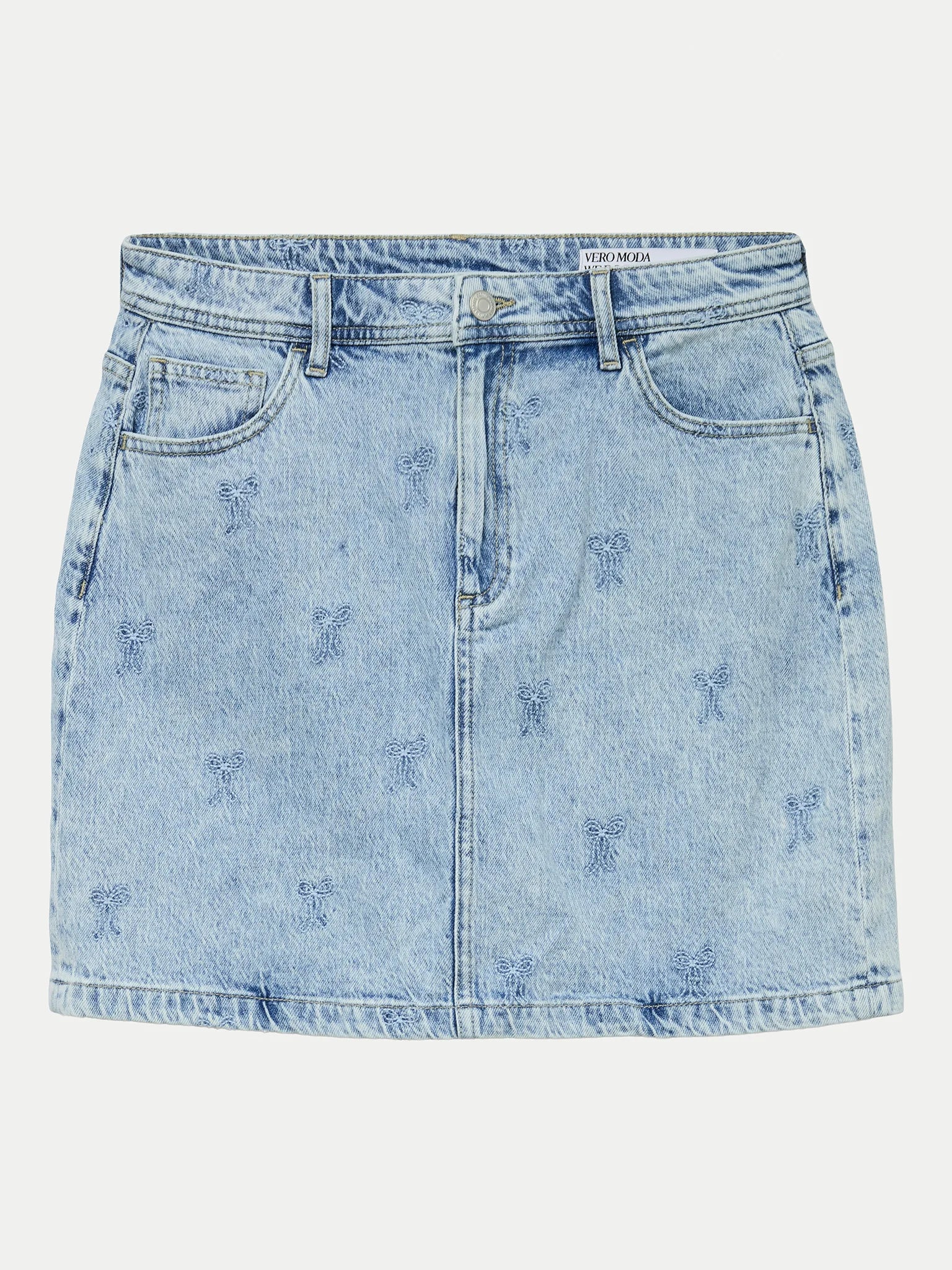 Denim is always a good idea! This denim skirt by VERO MODA is therefore perfect for summer thanks to the light blue color and fine length. Thanks to the subtle bow pattern, the skirt has a playful look and can be combined both casual and tough. Wear the women's skirt with a leather jacket and boots for a cool look.