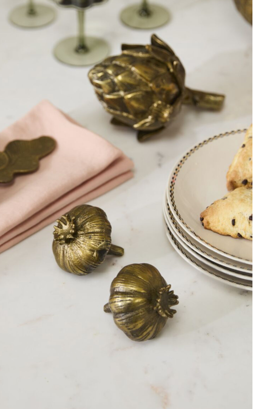Create hearty, long-lasting produce displays for spring or Easter on a dining table, console, or styled shelves with the antique gold cast aluminum Gilded Veggies Collection. These unique, detailed veggie sculptures are designed to layer together as bowl fillers for coordinated displays.