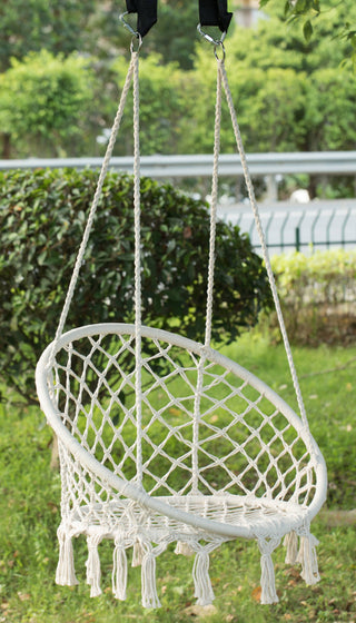 Bohemian chic hammock macrame net chair pattern with fringe tassels and composed out of durable cotton rope material that can hold up to 220 pounds. Lightweight and compatible design makes it easy to store and move from your bedroom, living room, garden, or yard!