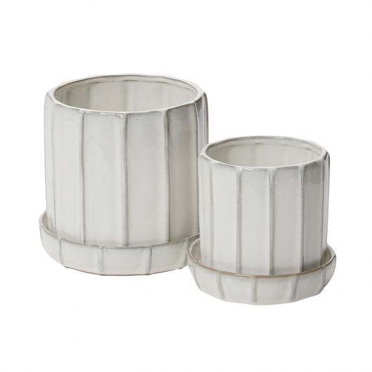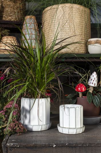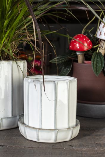 The Tamar Pot in creamy white glaze has a vertical ridged design, along with a drainage hole and saucer, proving the importance of attention to detail when you’re looking for the perfect pot.