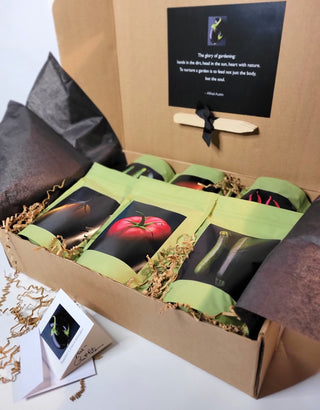 This gift box includes six varieties of organic fruit and vegetables, easy-to-follow directions for planting and transplanting along with hand tied wooden garden stakes.