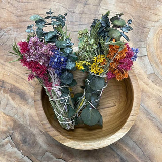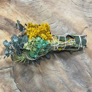 Using naturally harvested rosemary, baby eucalyptus and colorful wildflowers, we have this lovely statement smudge stick, when white sage by itself just won't do. Please note that different colors are visible from each side of the smudge stick. All sticks will have a little variety, as they are handmade and of natural materials.