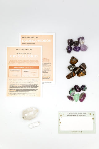 INCLUDES... - 20+ Crystals: Amethyst, Tiger Iron, Flourite, Clear Quartz - Dodecahedron Sacred Geometry Mat - Simple "HOW TO" Guide - Learning cards for crystals and geometry - 3 Intention Cards - so you can use this grid over and over!