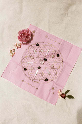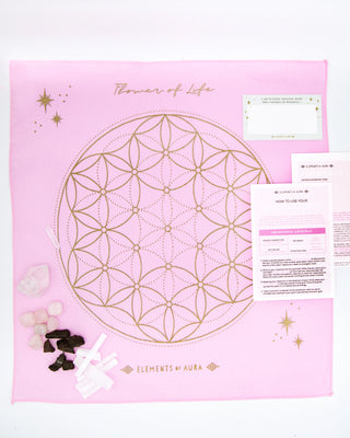 INCLUDES... - 20 Crystals: Selenite, Rose Quartz, Black Tourmaline, Clear Quartz - Flower of Life Sacred Geometry Mat - Simple "HOW TO" Guide - Detailed Info for all Crystals - 3 Intention Cards - so you can use this grid over and over!