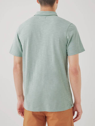 With a medium weight and premium fabric, the Field Polo is durable, breathable, and endlessly versatile. Don't you look ready for anything. Soft organic cotton with a touch of texture. Collar neck with three-button placket. Plant-based corozo buttons. Chest pocket on the left. Subtle side vents on the bottom hem. Straight hem, short sleeves. We recommend ordering your true size. Length, Size M: 28". Sleeve Length (From Center Back to Shoulder to Sleeve Opening), Size M: 18". GOTS Organic Certified. Machine wash cold. Tumble dry low.
