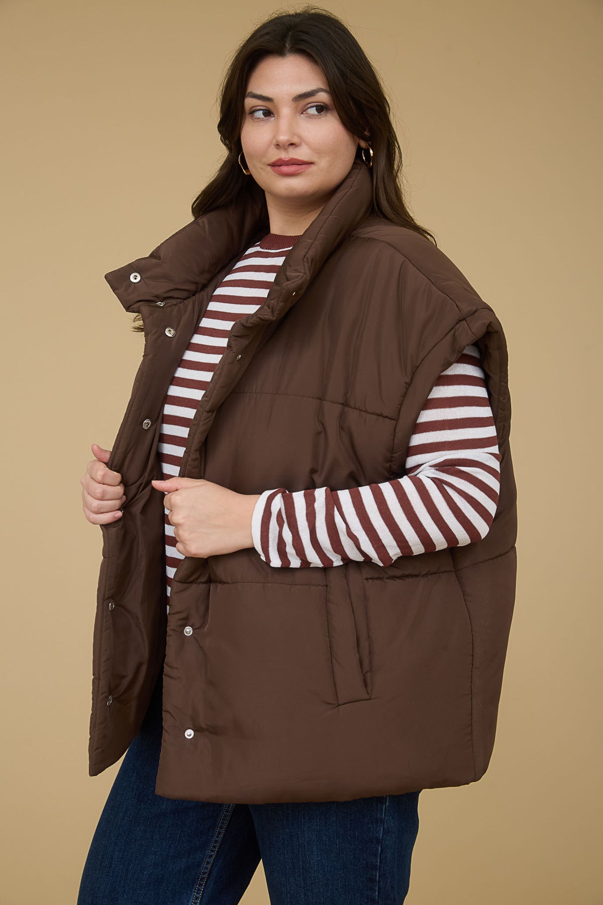 Stay cozy and stylish with the Grace Plus Snap Button Puffer Vest. This oversized, sleeveless vest features a playful mock neckline and drop shoulder design for an effortlessly cool look. Its solid color and smooth lining make it the perfect layering piece, while snap buttons add easy wearability. Made from 100% polyester for lightweight warmth and comfort, it’s your go-to vest for chilly days with a fun twist.