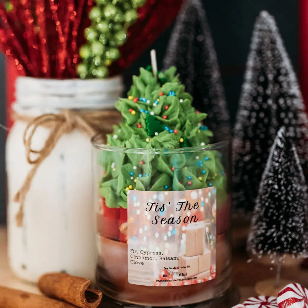 Santa's Sleigh Dessert: This delightful candle captures the essence of the season with enchanting notes of warm strudel, aromatic spices, and sweet cinnamon that fill the air with holiday cheer. Topped with charming soy wax figurines - a playful sleigh brimming with presents and a beyoutiful detailed snowy tree- this candle adds a whimsical touch to your decor.