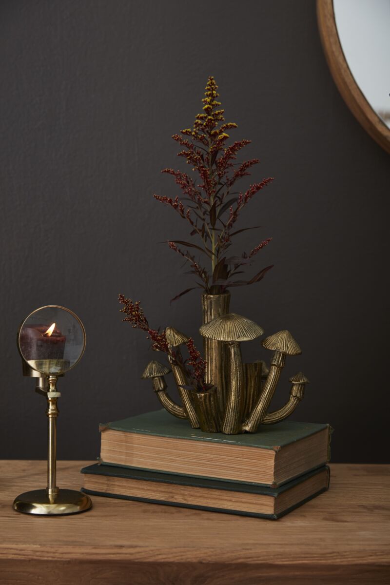 Who knew fungi could be so fun & functional? The recycled cast aluminum Clustered Mushrooms Budvase in an antique gold finish brings woodland charm to your favorite stems. 2 little tree trunks are hollowed out as watertight budvases, perfect for a few dried or fresh stems. Style on bookshelves, as a centerpiece, or on a console & layer with our other seasonal gold mushrooms as a budvase or decorative object.