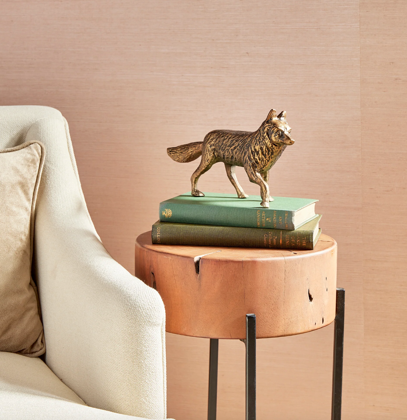 Made of a heavy cast aluminum, this sly fox is on the prowl. Definitely a sculpture worthy of a prime bookshelf spot. With realistic signature features, a stately addition to side table or ottoman, as well.