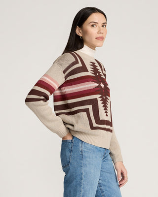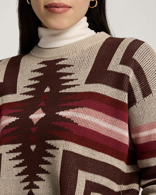 A soft cotton sweater with a placed jacquard pattern on front, back and sleeves. Features include a crew neckline, dropped shoulders, long sleeves and ribbed finishes. Lightweight enough for transitional wear.
