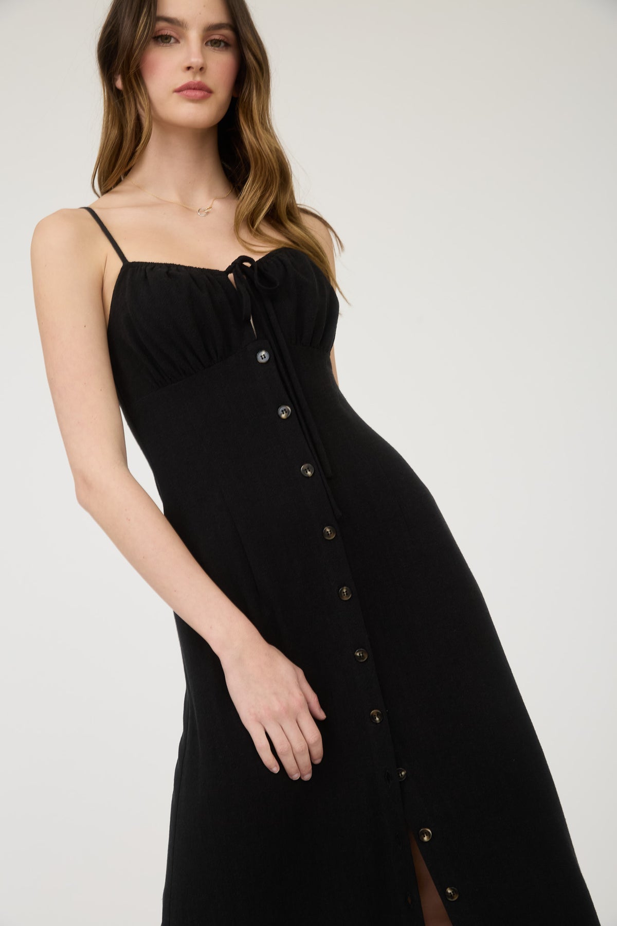 This playful midi dress features adjustable spaghetti straps and a charming front tie that adds a flirty touch. The ruched bust and functional button-down front create a flattering silhouette, while the lined design ensures comfort. Made from a soft blend of rayon and nylon with a polyester lining, it’s perfect for sunny days and casual outings.