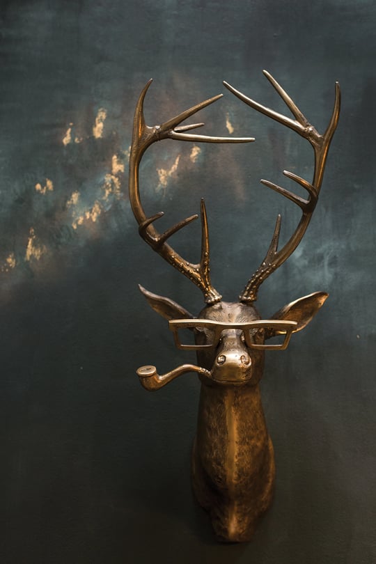 Add a whimsical touch to your space with the E+E Frankie Wall Mounted Deer Head. Crafted from durable metal in an antique-gold finish, this playful decor piece stands 47 inches tall, creating a bold statement without overwhelming your room. Its unique design brings a fun, quirky vibe while adding character and charm to any wall. Perfect for those who love distinctive accents with a lighthearted twist.
