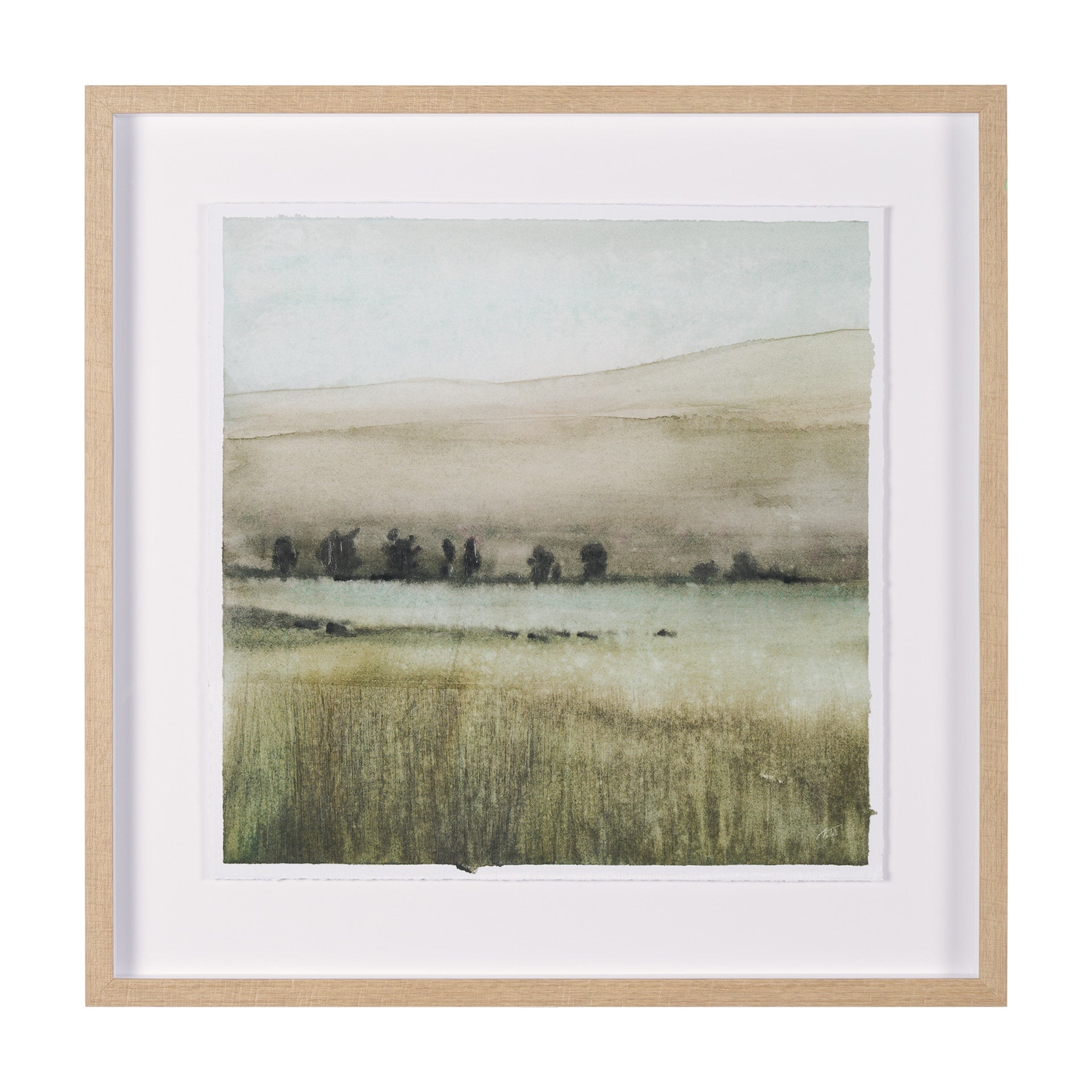 - This tranquil watercolor painting captures a sweeping landscape with layered hills, a scattering of trees, and a field of tall grass in soft, natural tones. The piece features torn edges, giving it an organic, handmade look that adds to its rustic charm. It is presented in a light wood frame with a crisp white mat that enhances the airy, peaceful quality of the artwork