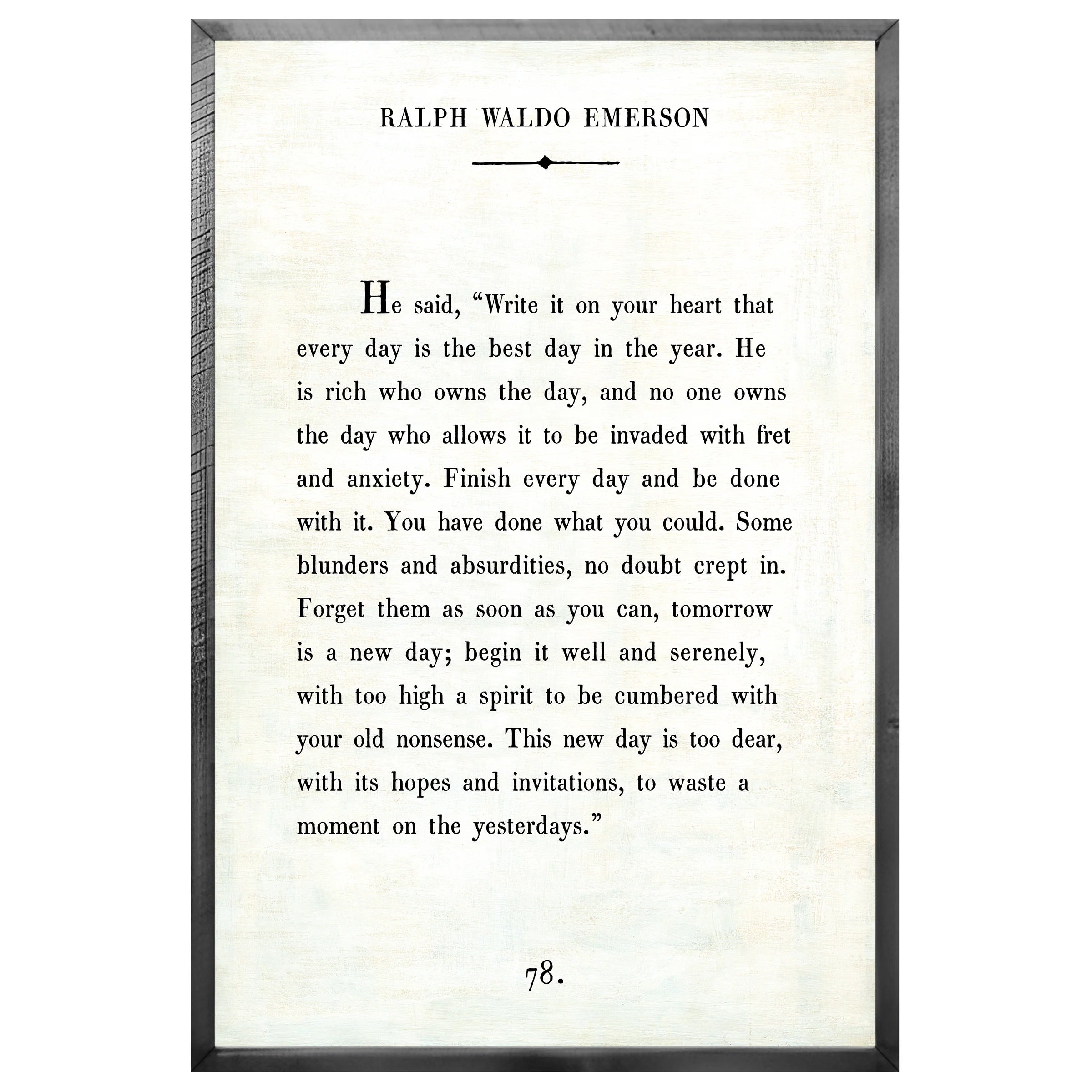 "He said, 'Write it on your heart that every day is the best day in the year. He is rich who owns the day, and no one owns the day who allows it to be invaded with fret and anxiety. Finish every day and be done with it. You have done what you could. Some blunders and absurdities, no doubt crept in. Forget them as soon as you can, tomorrow is a new day; begin it well and serenely, with too high a spirit to be cumbered with your old nonsense. This new day is too dear, with its hopes and invitations, to waste a moment on the yesterdays.'"