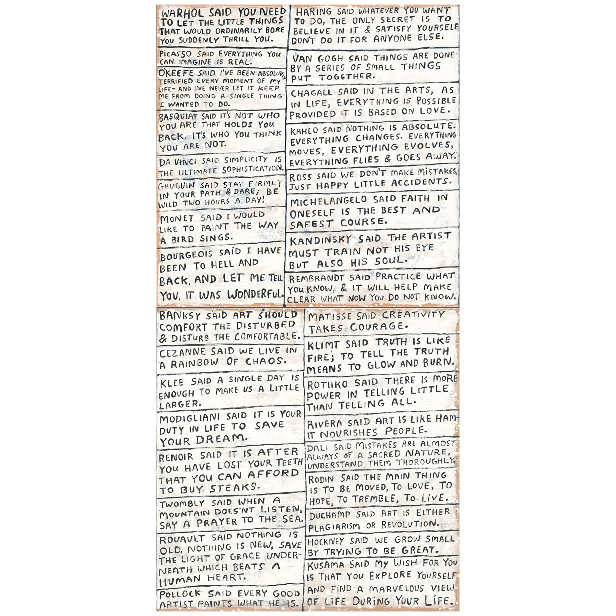 "Warhol said you need to let the little things that would ordinarily bore you suddenly thrill you. Haring said whatever you want to do, the only secret is to believe in it and satisfy yourself. Don't do it for anyone else. Picasso said everything you can imagine is real. Van Gogh said things are done by a series of small things put together. O'Keefe said I've been absolutely terrified every moment of my life- and I've never let it keep me from doing a single thing I wanted to do. Chagall said in the arts, as in life, everything is possible provided it is based on love. Basquiat said it's not who you are that holds you back, it's who you think you are not. Kahlo said nothing is absolute. Everything changes. Everything moves, everything evolves, everything flies & goes away. Da Vinci said simplicity is the ultimate sophistication. Ross said we don't make mistakes, just happy little accidents. Gauguin said stay firmly in your path & dare; be wild two hours a day! Michelangelo said faith in oneself is the best and safest course. Monet said I would like to paint the way a bird sings. Kandinsky said the artist must train not his eye but also his soul. Bourgeois said I have been to hell and back, and let me tell you, it was wonderful. Rembrandt said practice what you know, & it will help make clear what now you do not know.