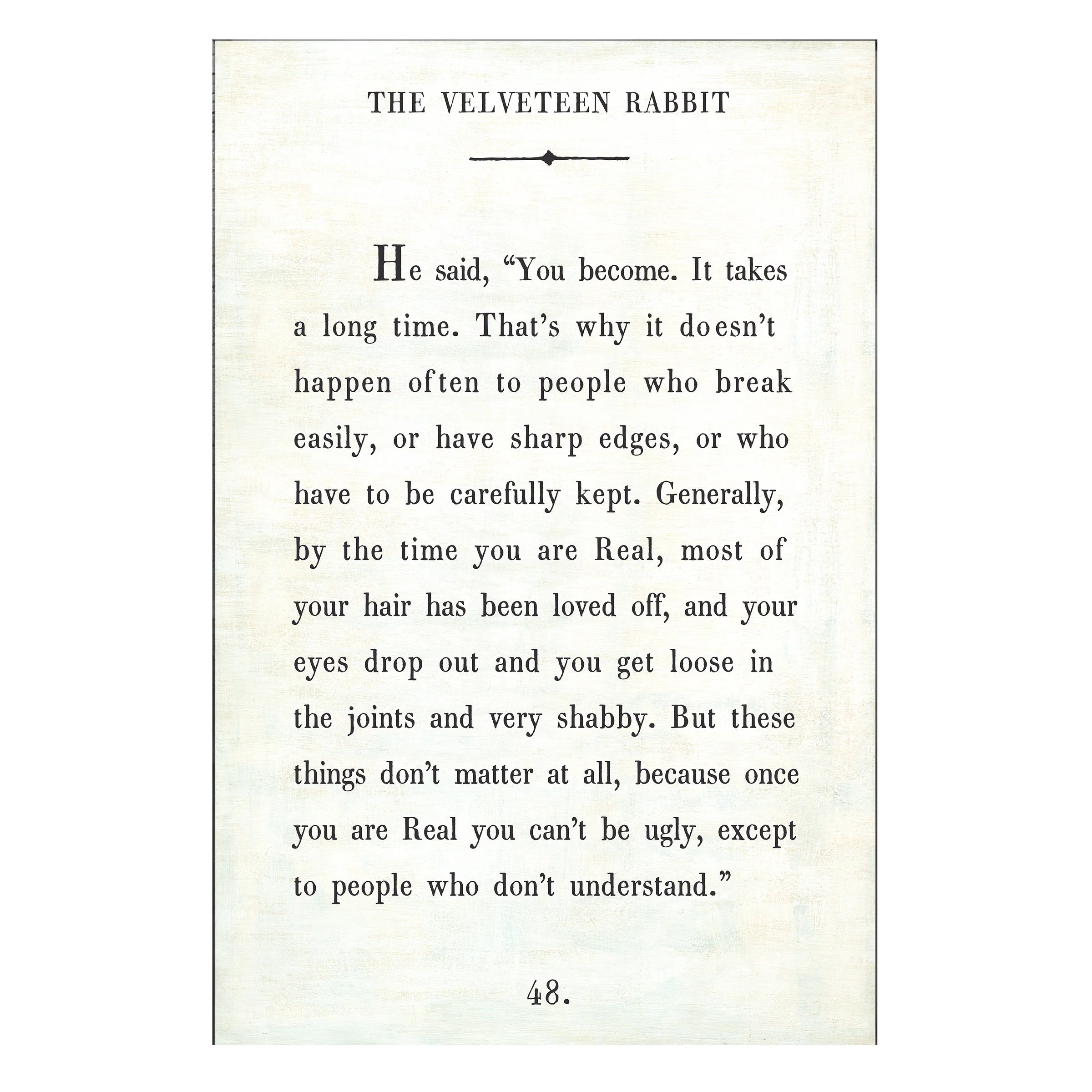 "He said, 'You become. It takes a long time. That's why it doesn't happen often to people who break easily, or have sharp edges, or who have to be carefully kept. Generally, by the time you are Real, most of your hair has been loved off, and your eyes drop out and you get loose in the joints and very shabby. But these things don't matter at all, because once you are Real you can't be ugly, except to people who don't understand.'"