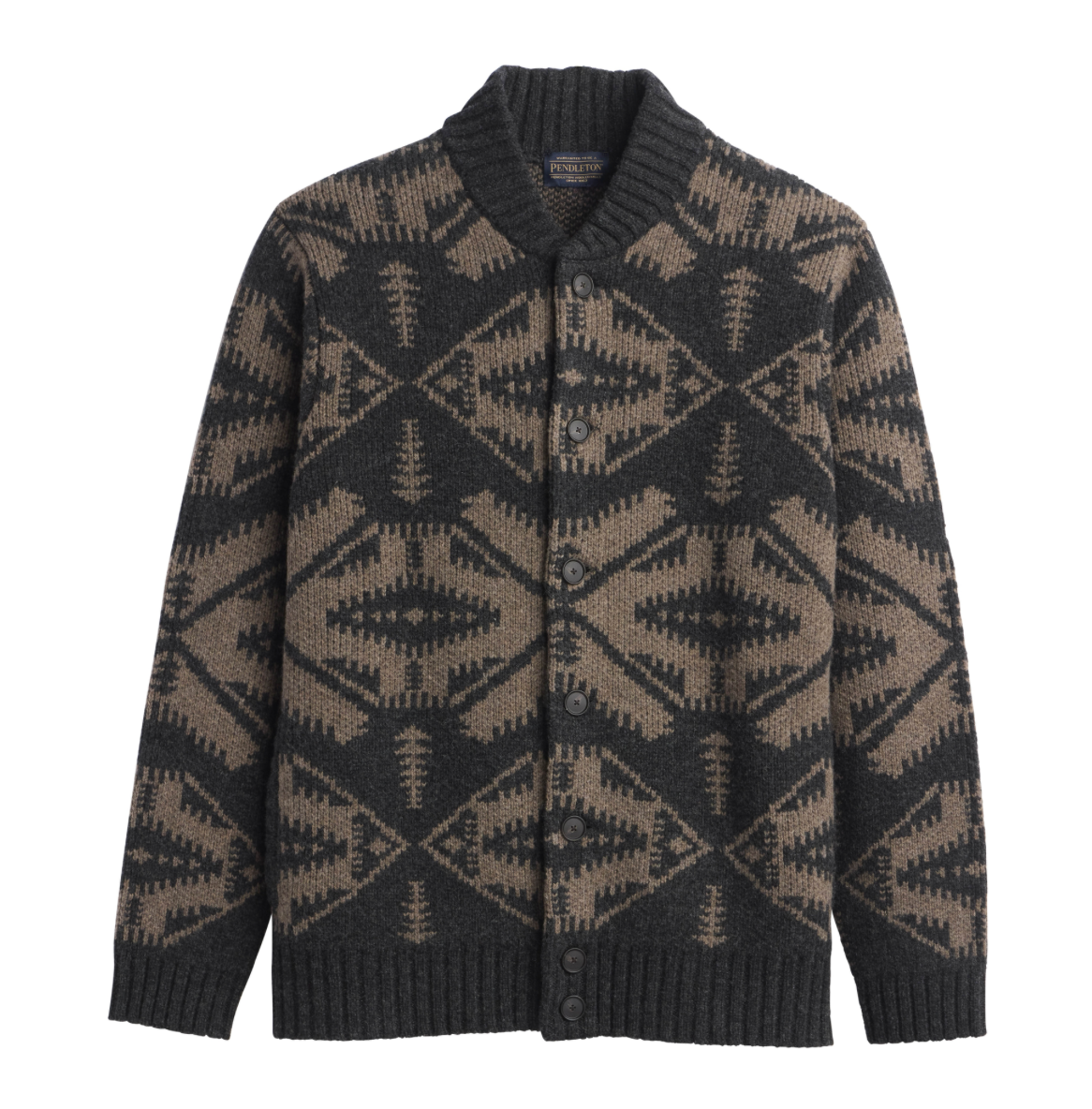 27 inches long. A sophisticated tonal take on Pendleton Woolen Mills' Mirror Lake jacquard pattern makes this Wool Cardigan a go-to for work or play. Button front with knit baseball collar and set-in sleeves. Ribbed contrast collar, cuffs, hem.