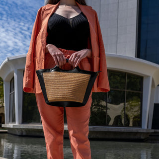 Whether you're headed poolside or to an outdoor lunch, the Amalfi top handle tote was designed with a spacious interior to hold all warm-weather necessities. Features recycled vegan leather paneling and chemical-free cotton lining. Carry from top handles or attach crossbody strap to go hands-free.