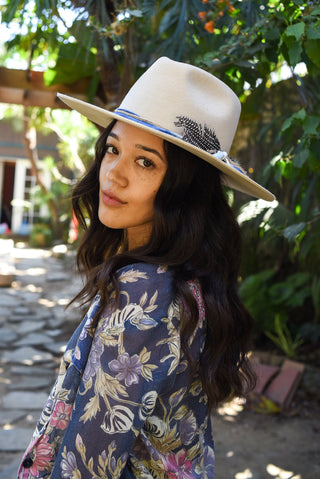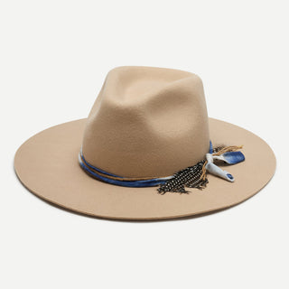 Carissa is a classic stiff wide cut brim fedora style constructed of 100% Australian wool felt. Her high pinched crown and her mix of trim details are stunning and sure to match any style! Trim details include a sky dyed wrap, jute rope, and feather accent.