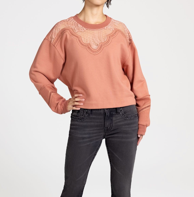 Wrap yourself in charm with the Miss Me Beth West Lace Sweater. Its subtle Western-inspired lace detail adds a delicate, playful twist to the soft mauve pink fabric, perfect for adding a touch of whimsy to any outfit. Cozy yet feminine, this sweater effortlessly blends comfort with a hint of frontier flair.