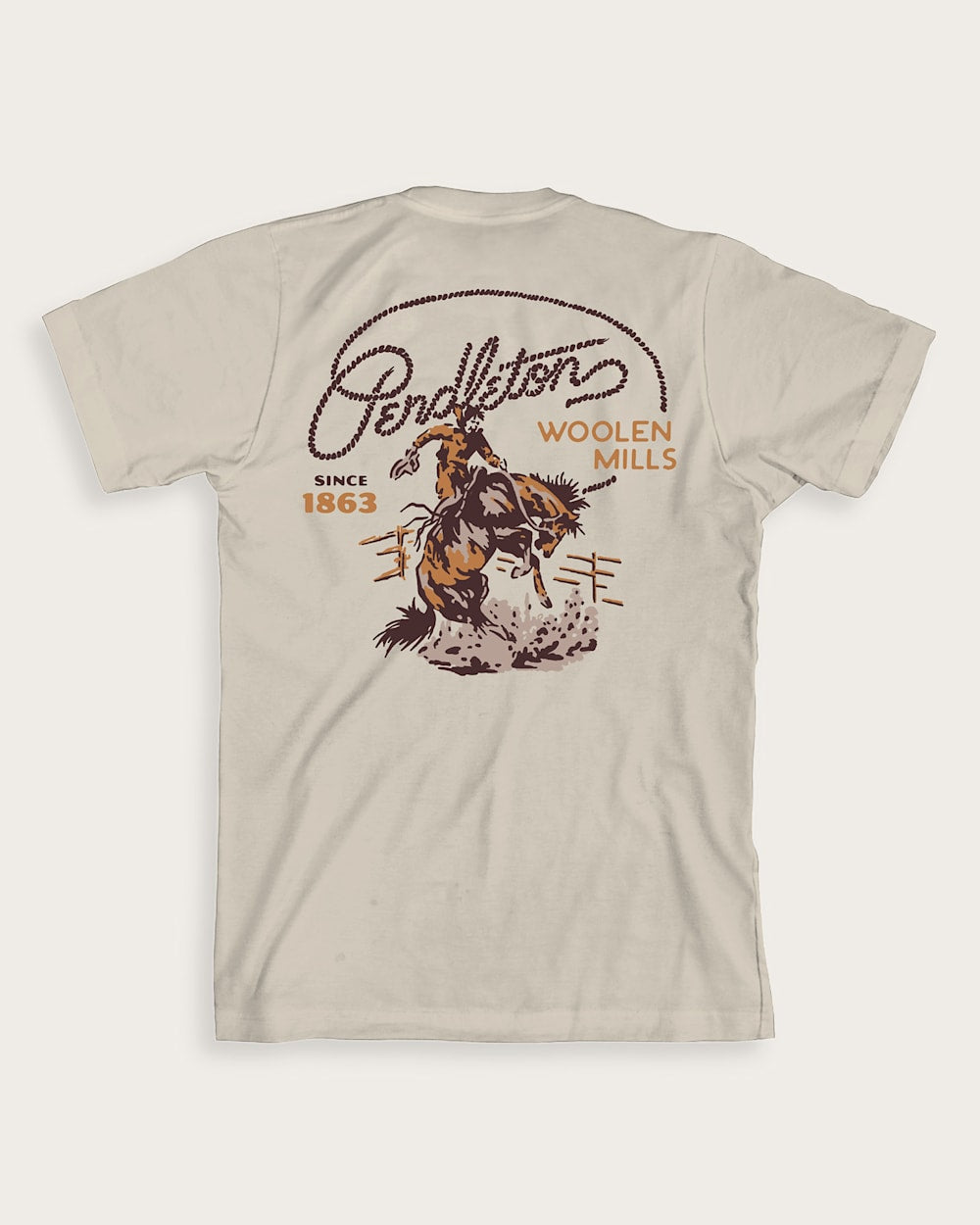 A graphic tee celebrating the grit and spirit of the rodeo. Vintage-inspired Pendleton logo on the front, with a large back graphic featuring a bucking bronco and rider. Printed on garment-dyed cotton jersey that softens with every wash. Finished with a classic fit and crew neckline.