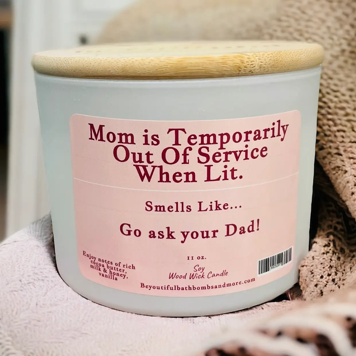 Moms out of Service: Our "Mom Is Temporarily Out Of Service" candle offers a blend of rich cocoa butter, milk and honey, and vanilla, combined with a playful label that humorously suggests mom needs a break. Perfect for gifting to moms who deserve some relaxation and laughter.