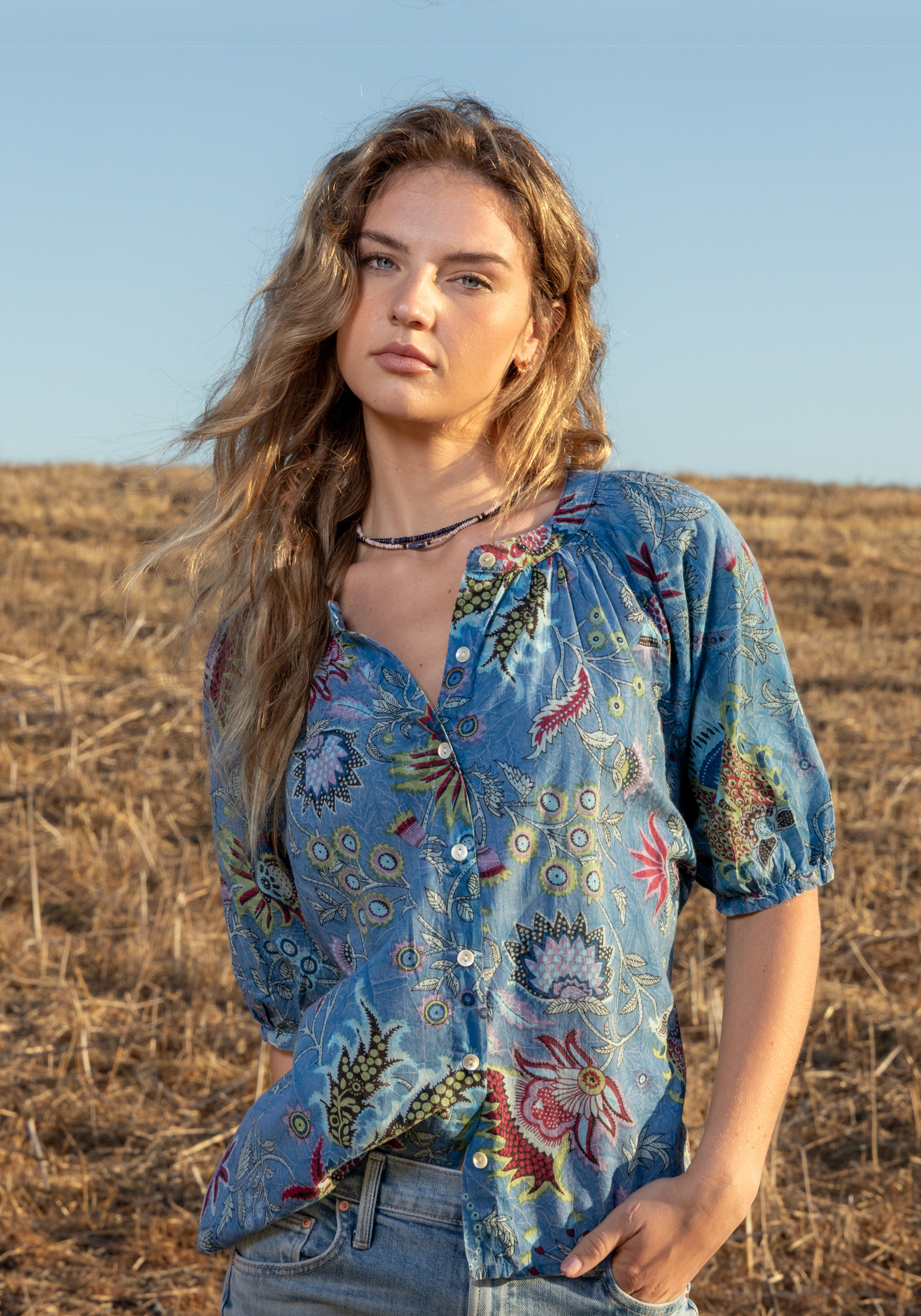 The Dylan Laurel Blouse brings a playful splash of floral blue perfect for transitioning from summer to fall. Its light, breezy fabric keeps you cool on warm days, while the charming print adds a fresh, vibrant touch as the seasons change. Pair it with your favorite jeans or a cozy cardigan to effortlessly brighten up your autumn wardrobe.