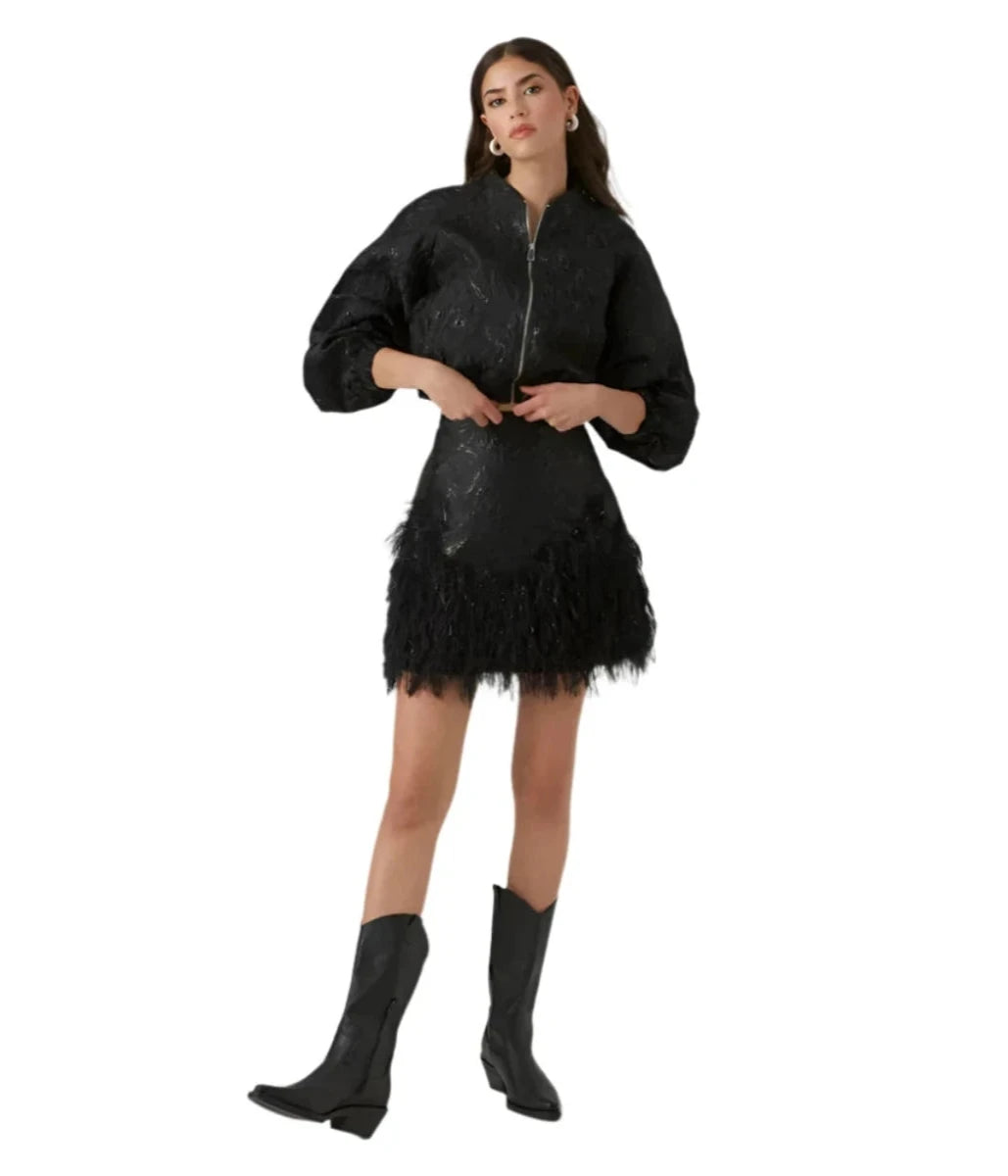 Feathery fringe and glittering metallic threads bring event-worthy glamour to this slightly asymmetric skirt cut with a high waist.