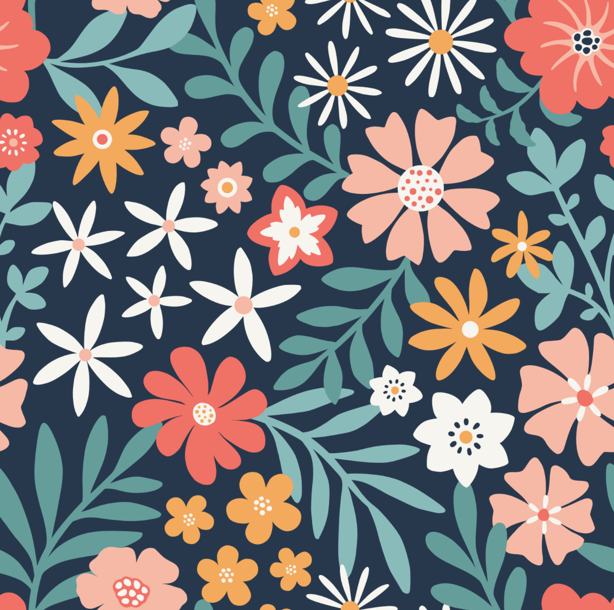 Maren Fall Floral — Meet Maren, a gorgeous floral print perfect for the transition from summer to fall. Peach, gold, and pink flowers adorn a navy background.