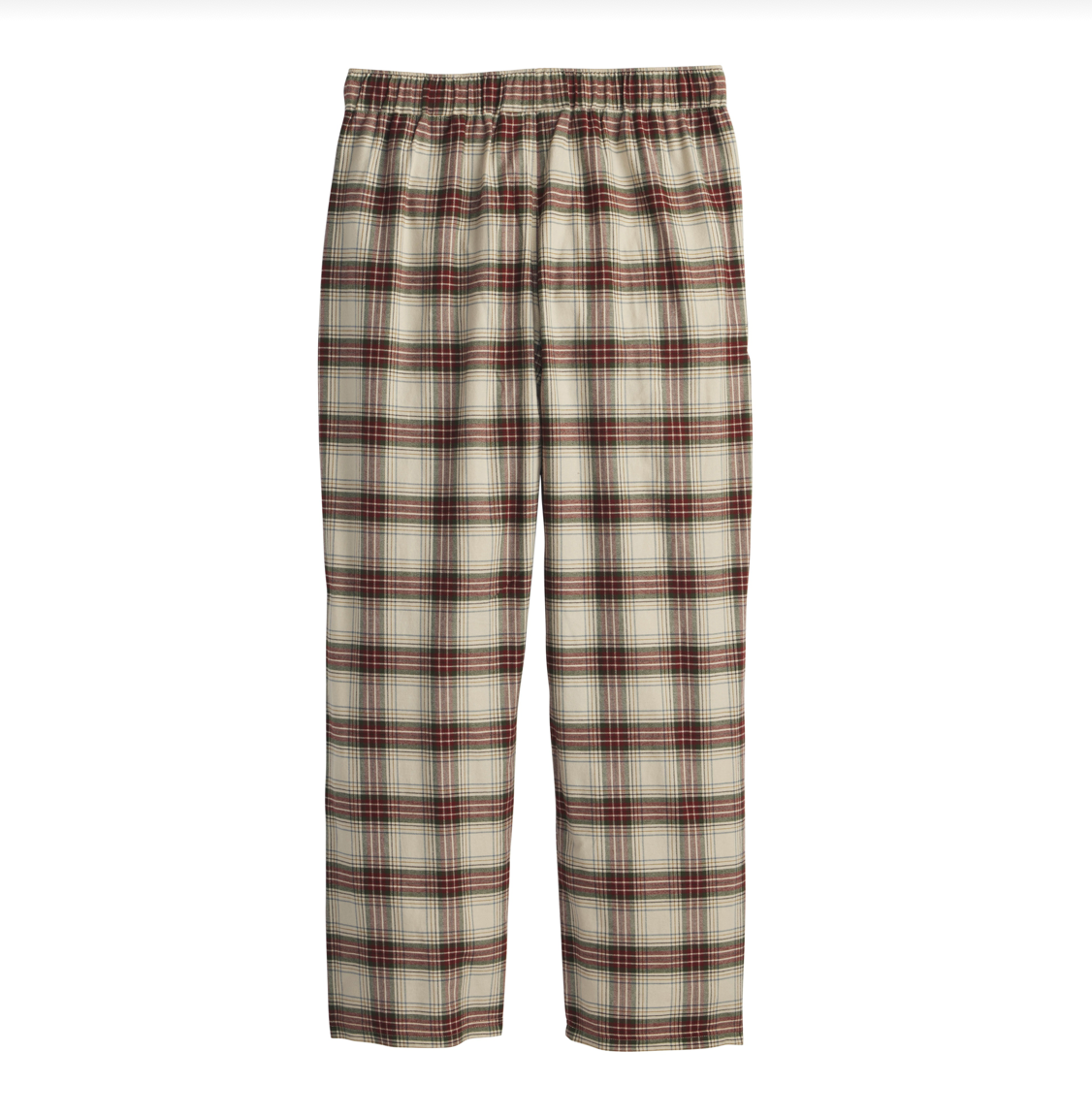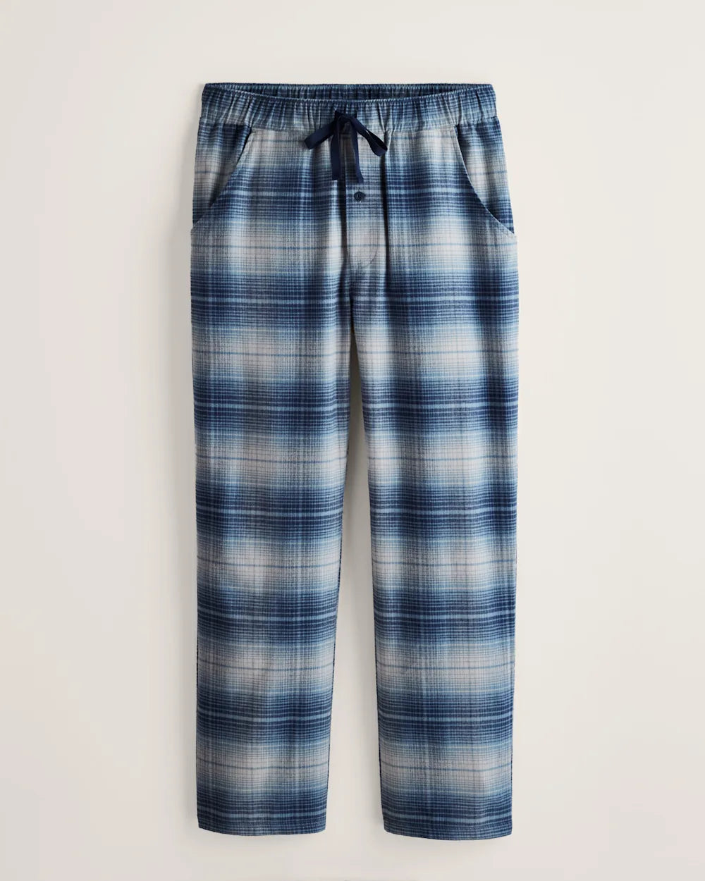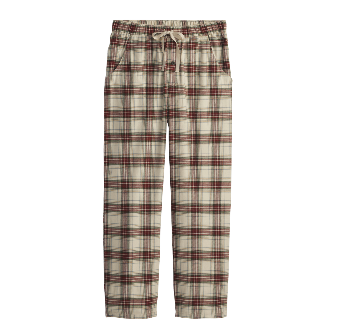 Men's soft, pure cotton flannel pajama pants in classic plaids, with an elastic/tie waist, button fly and two side-seam pockets.