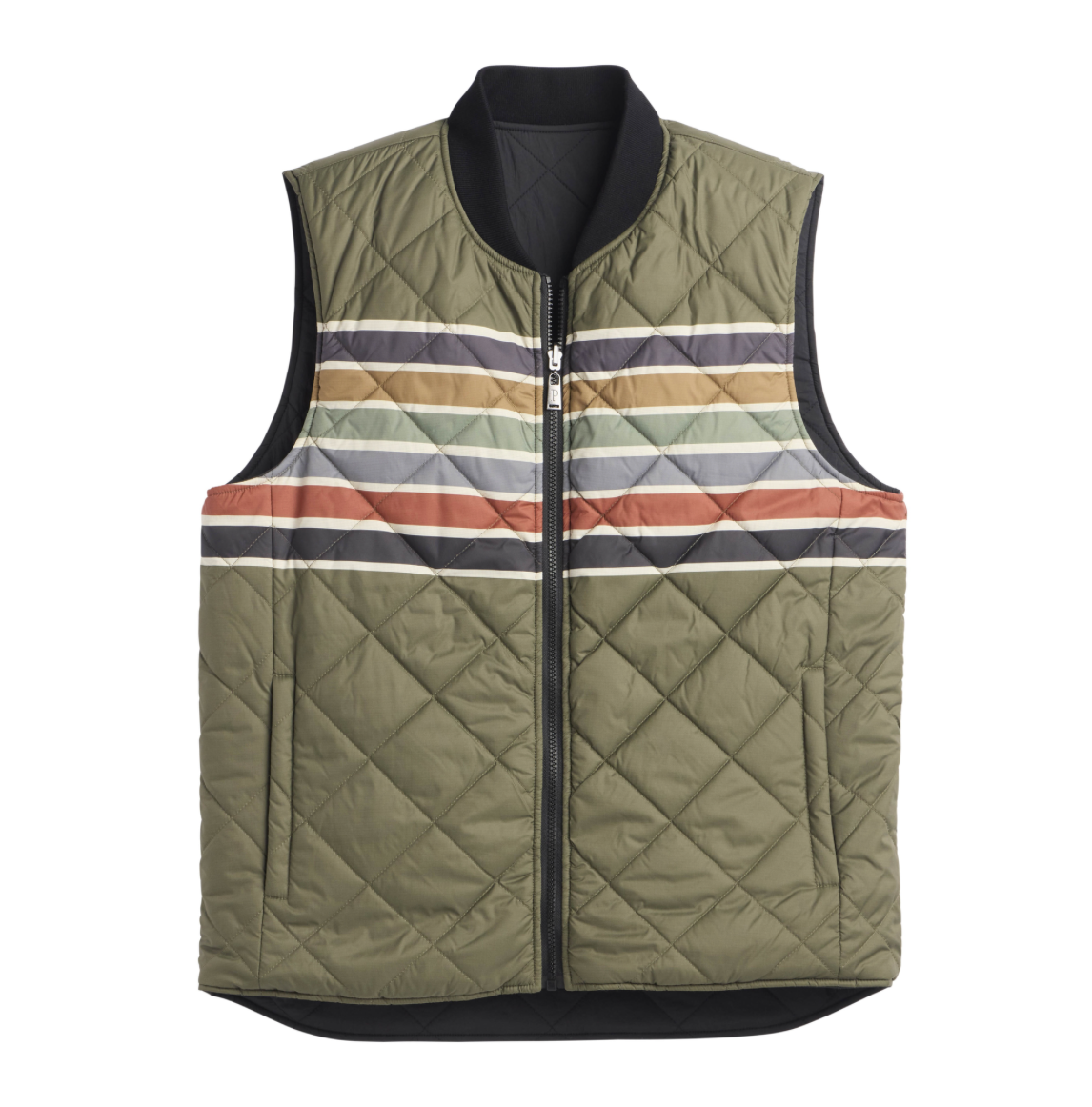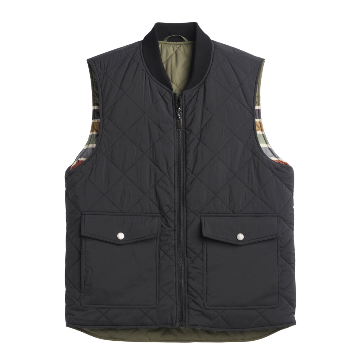 This quilted vest is perfect for your next outdoor adventure. With one solid side and one patterned side, this ideal layer offers two looks in one. Features a knit baseball collar, a zip closure, zip welt pockets on the patterned side, and snap-flap pockets on the solid side. Ideal for layering, travel, or transitional seasons.