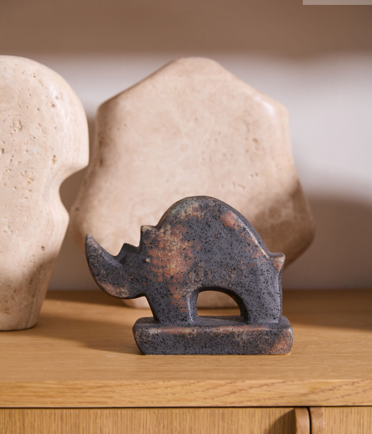 A friendly, understated addition to a desk or styled shelves, the abstract ceramic Rhino Sculpture brings an artful, aged look with its charcoal matte finish & rust brown & grey tones across the surface. With its stone-like appearance, it blends in with multiple materials & offers the perfect scale for layering among other home accent pieces.
