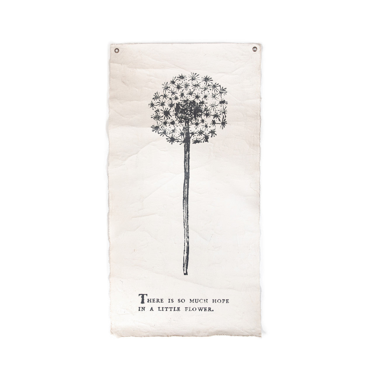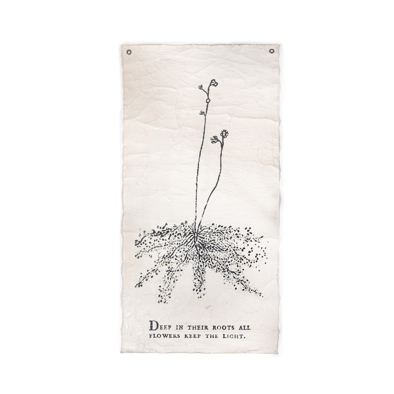Sugarboo & Co's Botanical tarps are based off of Rebecca's love of anything that grows from the earth, mixed with meaningful words. The handmade nature of these crackled tarps make them a casual relaxed way to introduce nature into a home while covering a lot of wall space. Each tarp comes with grommets at the top to use for hanging. We recommend using our hand forged metal nails.