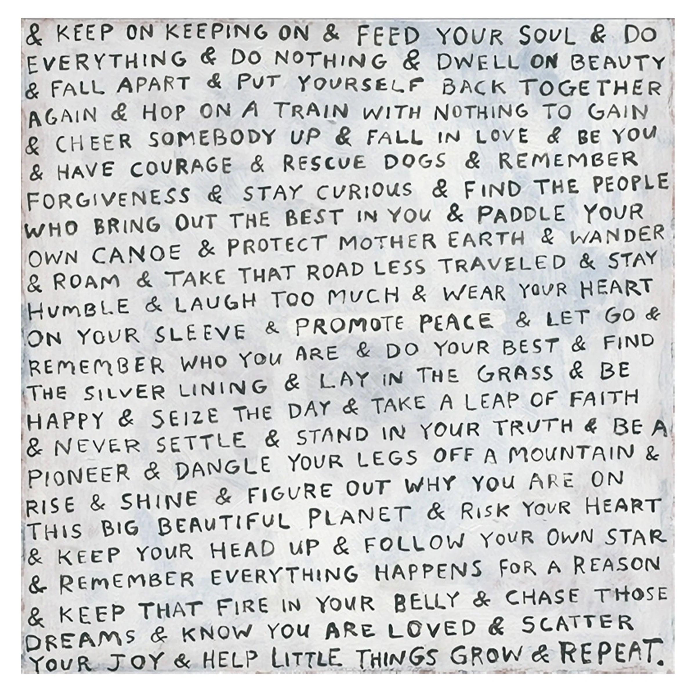BOTTOM PANEL: “& Keep On Keeping On & Feed Your Soul & Do Everything & Do Nothing & Dwell on Beauty & Fall Apart & Put Yourself Back Together Again & Hop on a Train with Nothing to Gain & Cheer Somebody Up & Fall in Love & Be You & Have Courage & Rescue Dogs & Remember Forgiveness & Stay Curious & Find the People Who Bring Out the Best in You & Paddle Your Own Canoe & Protect Mother Earth & Wander & Roam & Take that Road Less Traveled & Stay Humble & Laugh Too Much & Wear Your Heart on Your Sleeve & Promote Peace & Let Go & Remember Who You Are & Do Your Best & Find the Silver Lining & Lay in the Grass & Be Happy & Seize the Day & Take a Leap of Faith & Never Settle & Stand in Your Truth & Be a Pioneer & Dangle Your Legs Off a Mountain & Rise & Shine & Figure Out Why You Are on this Big Beautiful Planet & Risk Your Heart & Keep Your Head Up & Follow Your Own Star & Remember Everything Happens for a Reason & Keep that Fire in Your Belly & Chase Those Dreams & Know You are Loved & Scatter Your Joy & Help Little Things Grow & Repeat.”