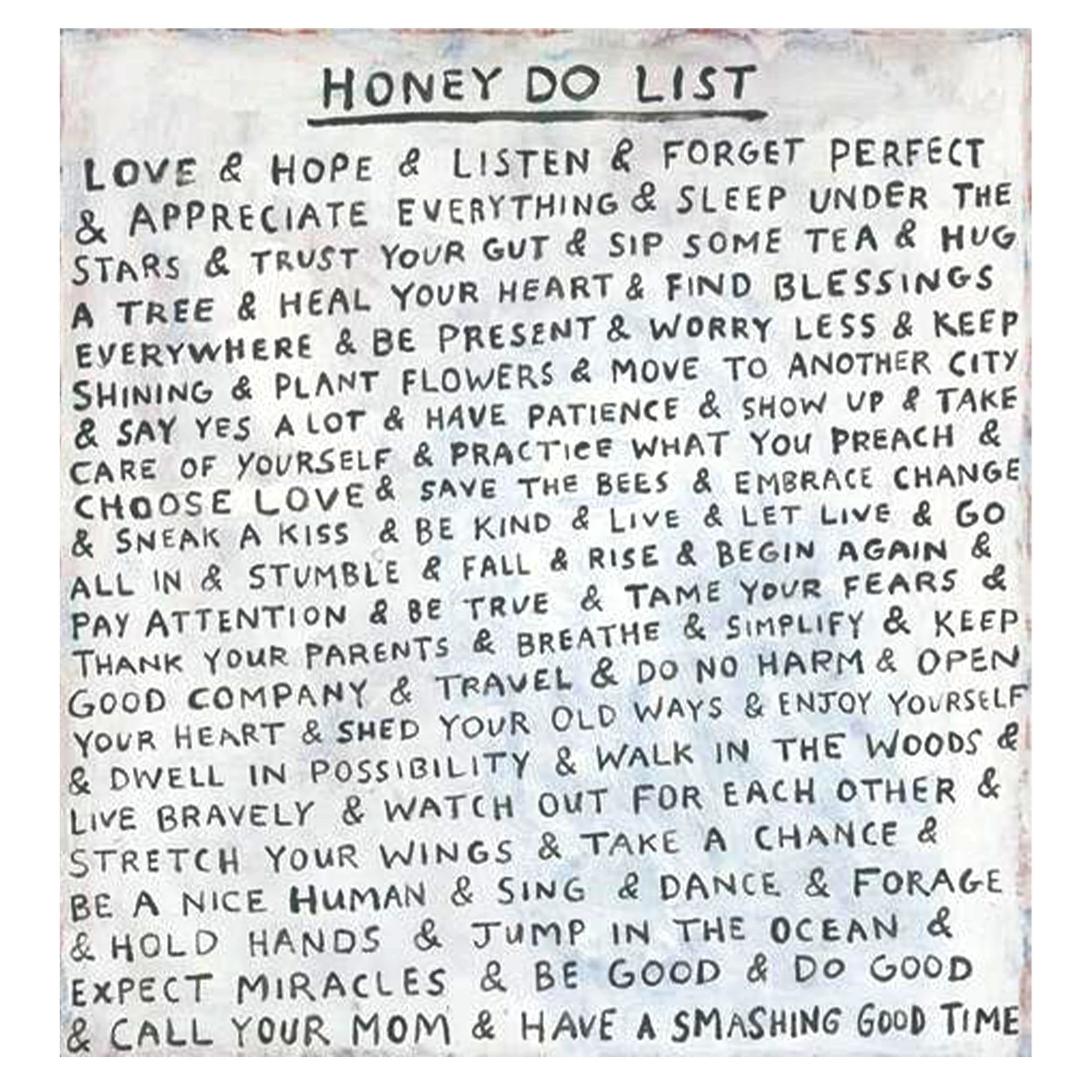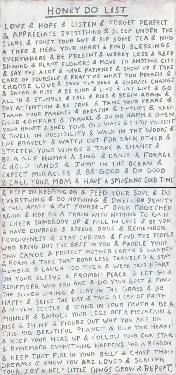 TOP PANEL: “Love & Hope & Listen & Forget Perfect & Appreciate Everything & Sleep Under the Stars & Trust Your Gut & Sip Some Tea & Hug a Tree & Heal Your Heart & Find Blessings Everywhere & Be Present & Worry Less & Keep Shining & Plant Flowers & Move to Another City & Say Yes A Lot & Have Patience & Show Up & Take Care of Yourself & Practice What You Preach & Choose Love & Save the Bees & Embrace Change & Sneak a Kiss & Be Kind & Live & Let Live & Go All in & Stumble & Fall & Rise & Begin Again & Pay Attention & Be True & Tame Your Fears & Thank Your Parents & Breathe & Simplify & Keep Good Company & Travel & Do No Harm & Open Your Heart & Shed Your Old Ways & Enjoy Yourself & Dwell in Possibility & Walk in the Woods & Live Bravely & Watch Out for Each Other & Stretch Your Wings & Take a Chance & Be a Nice Human & Sing & Dance & Forage & Hold Hands & Jump in the Ocean & Expect Miracles & Be Good & Do Good & Call Your Mom & Have a Smashing Good Time”