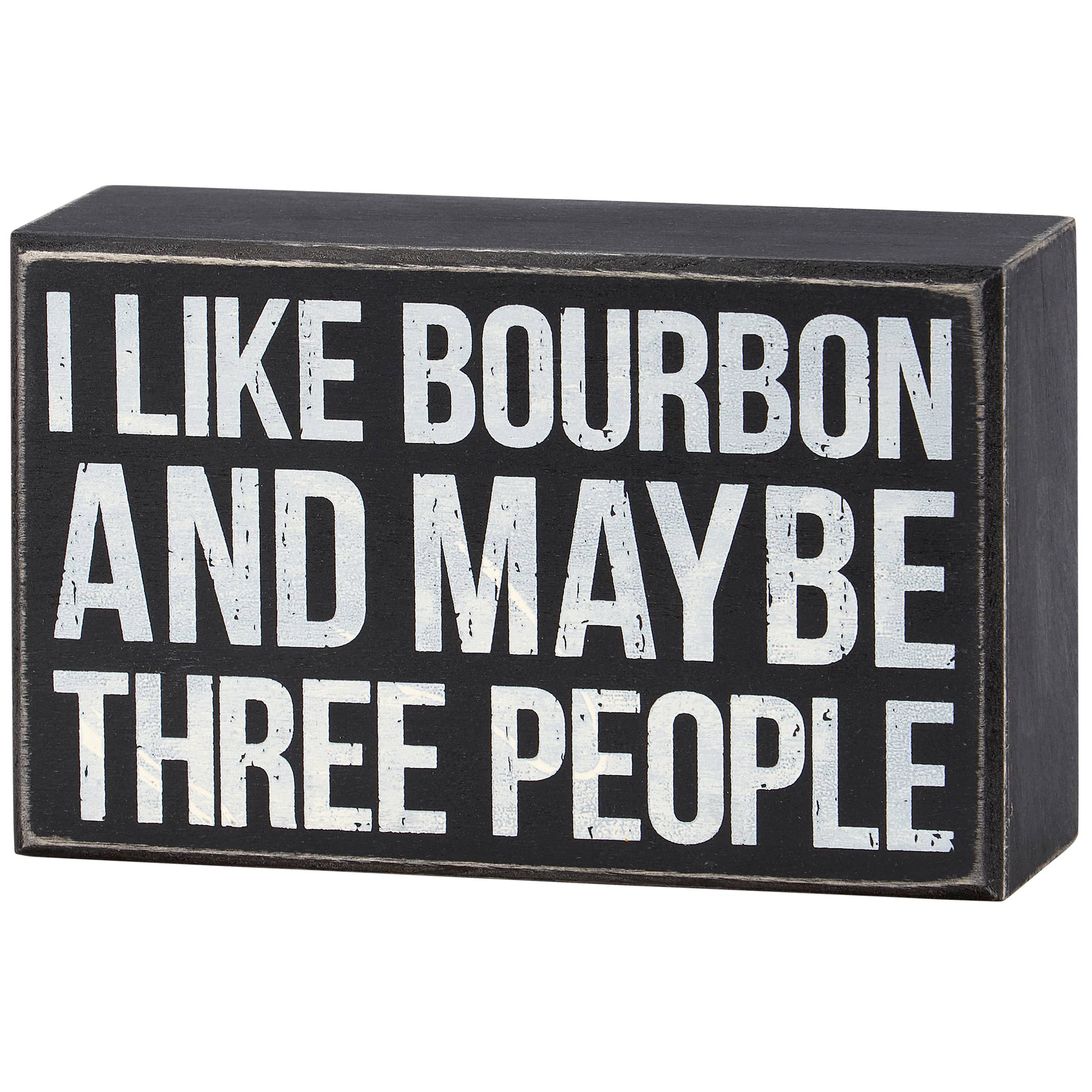 A classic black and white wooden box sign displaying a humorous alcohol inspired sentiment that reads "I Like Bourbon And Maybe Three People." Funny box sign features distressed details with coordinating black color on sides and back. Our I Like Bourbon box sign is easy to hang or can free-stand alone. A funny alcohol-themed gift that can be easily displayed in any home or work space.