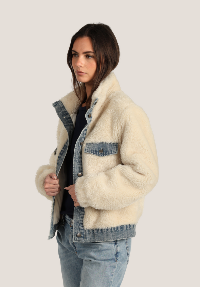 Bring a fun twist to your outerwear with the Dylan Sawyer Shearling Denim Jacket. Crafted from 100% polyester, this jacket features cozy shearling trim paired with cool denim accents for a bold, playful look. Perfect for adding texture and warmth to your casual style while keeping things lighthearted and fresh.