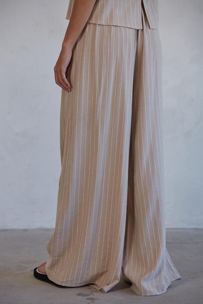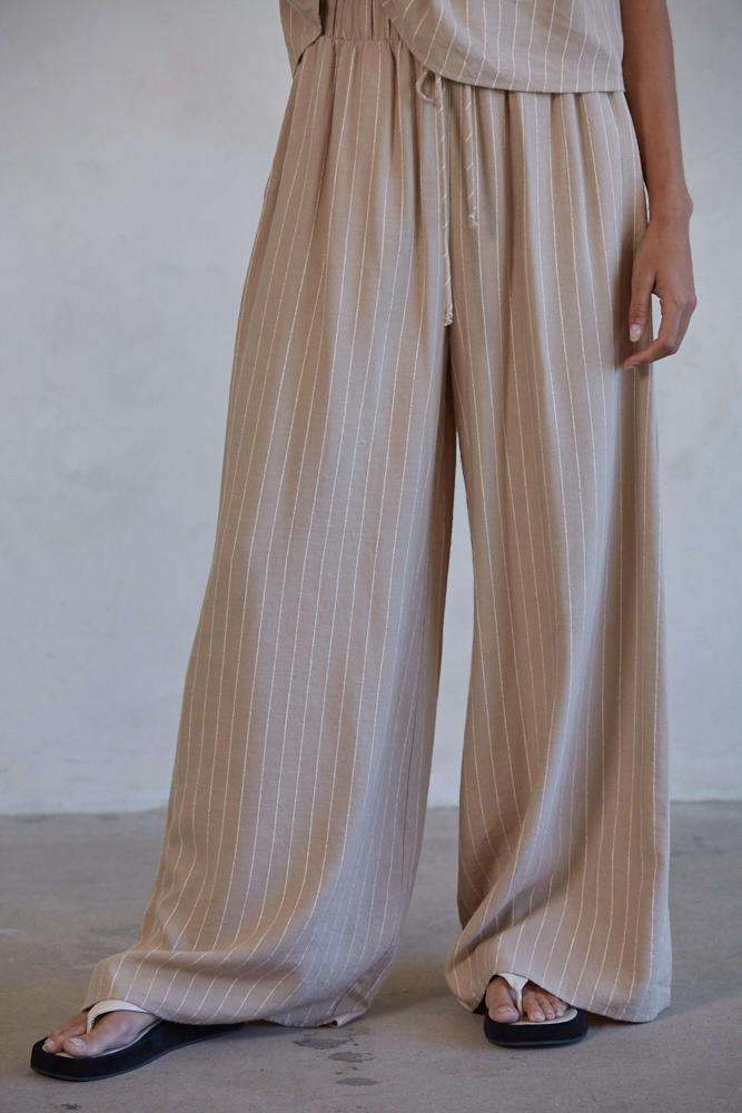 Introducing Elara Wide Leg Pants - the perfect addition to your summer wardrobe! These stylish pants feature a trendy pinstripe design and a comfortable drawstring waist. Upgrade your summer look with these chic and versatile pants.