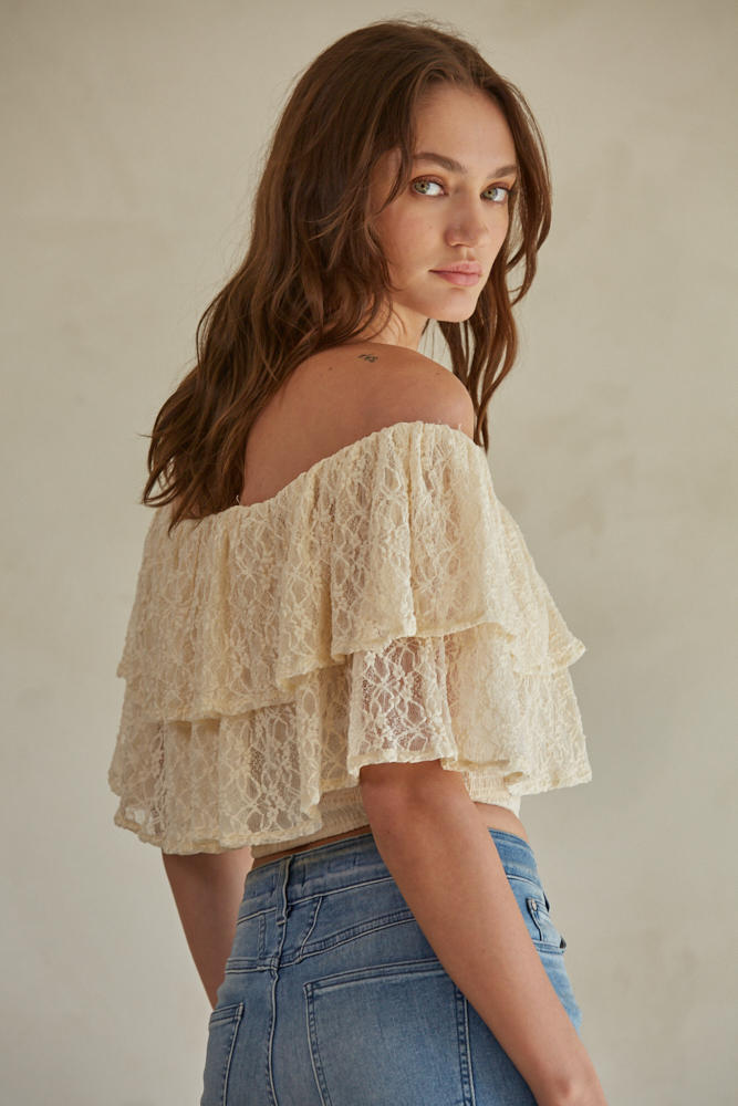 Add a flirty touch to your wardrobe with the Suri Lace Top. This off-the-shoulder pullover top features a beautiful floral lace design and short tiered sleeves. Made with a comfortable blend of woven nylon and spandex, it's perfect for a fun night out with friends.