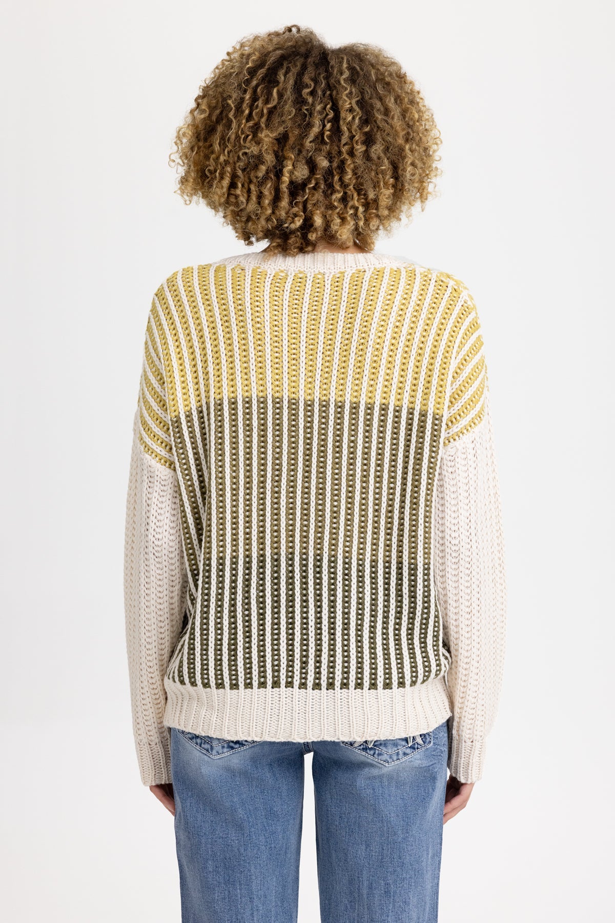 Brighten your wardrobe with the Miss Me Theresa Crocheted Crewneck, featuring a playful blend of two-tone yellow and olive crochet. The crisp white neck and sleeves, accented with striped lining, add a fresh, fun twist to this cozy piece. Perfect for adding a splash of color and charm to any casual outfit.