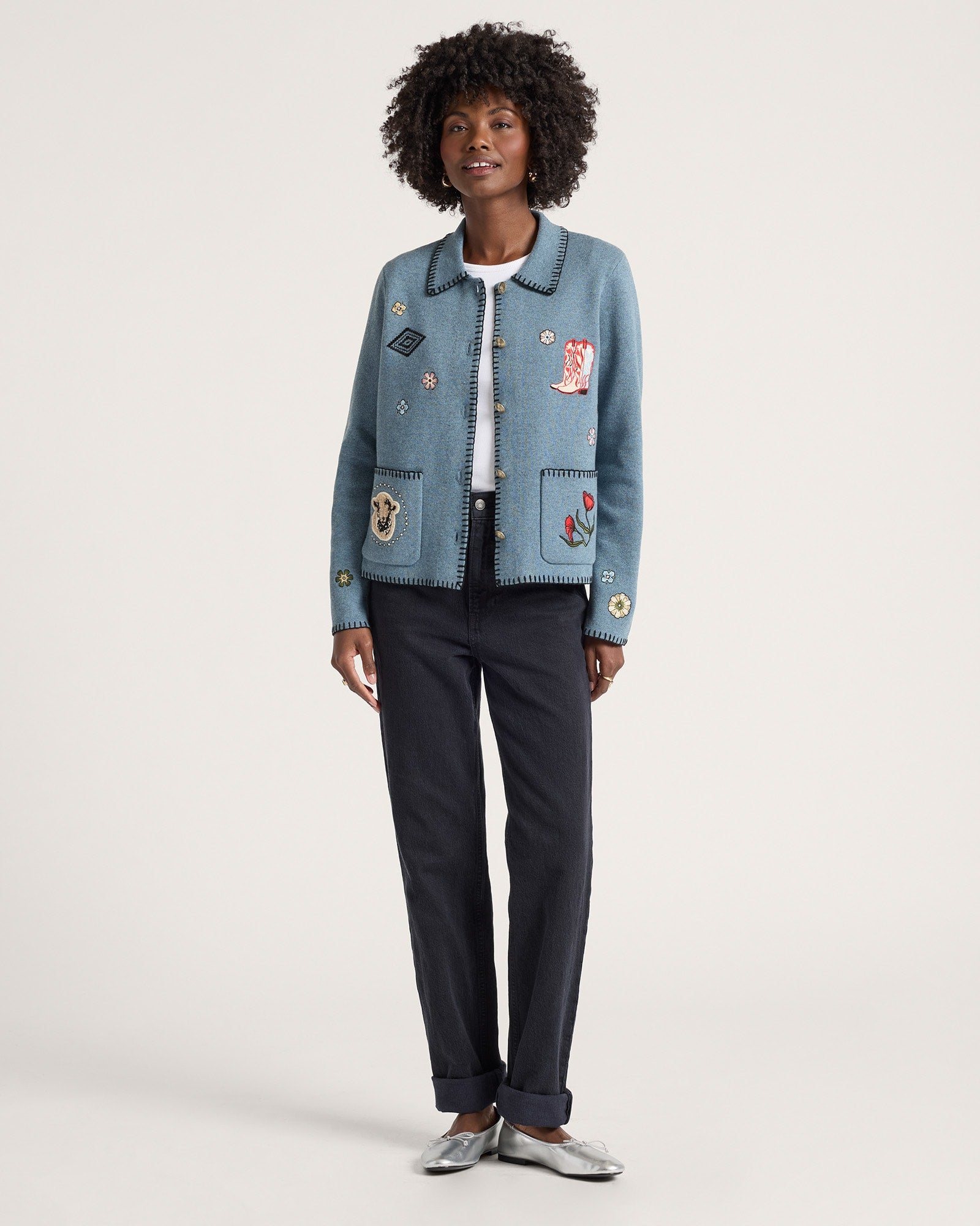 This souvenir cardigan is back with fun new appliquéd symbols of the West – boots, poppies, sheep, and more. With two patch pockets, a fold down collar, vintage-inspired silvertone novelty buttons, and contrasting whipstitch accents, this whimsical layer is classic and timeless.