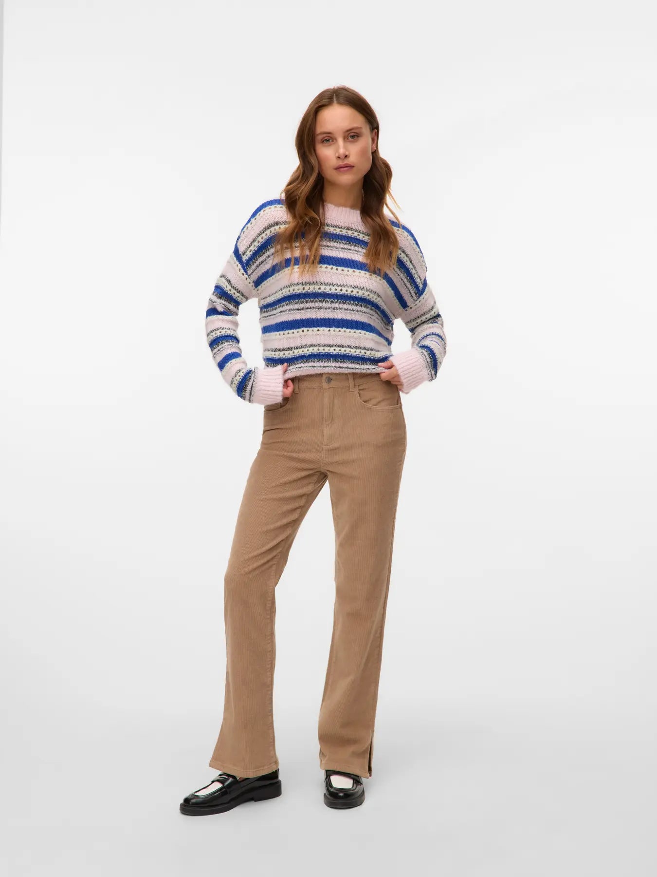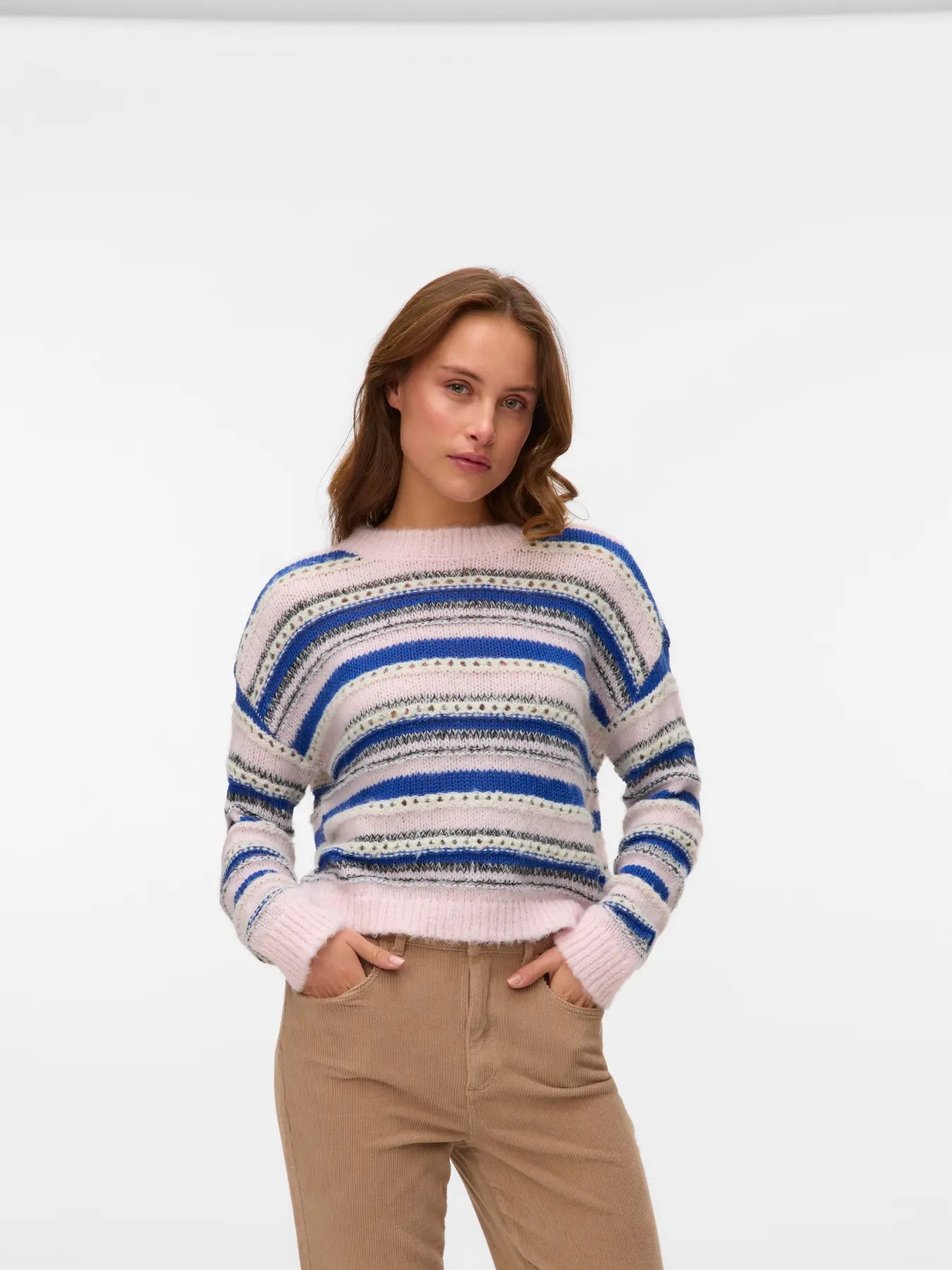 Wrap yourself in playful comfort with the Vero Moda Lenora Striped Sweater. This cozy pullover features cheerful stripes and charming pale pink solid cuffs and neckline that add a sweet touch to your everyday look. Perfect for chilly days, its soft fabric keeps you warm while adding a splash of fun to your outfit.