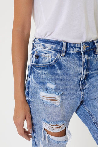 Bring out your playful side with this heavily distressed pair of boyfriend jeans with a relaxed fit featuring whiskering, heavy distressing details, single-button closure, and a 5-pocket design.