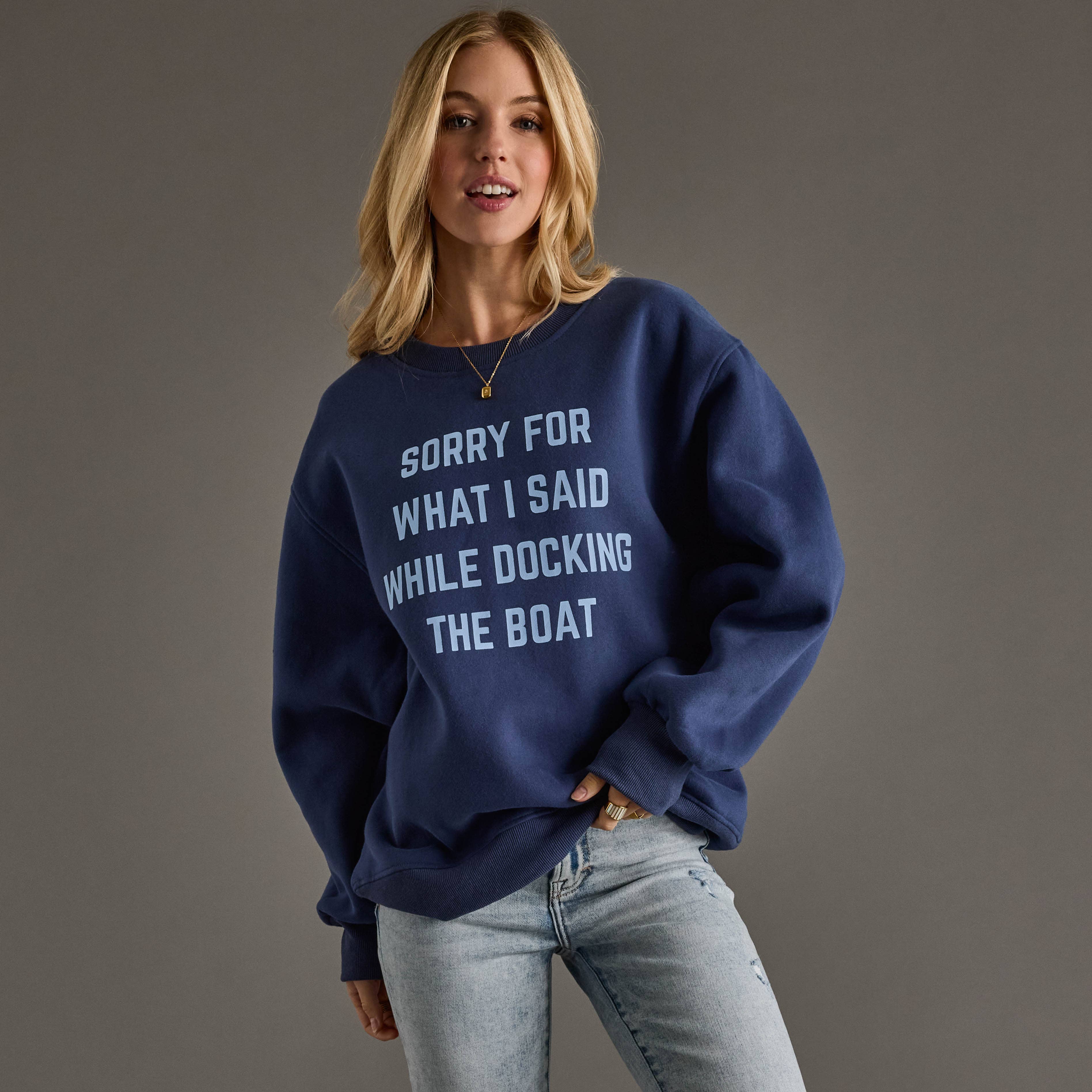 Dark blue sweatshirt with a light blue graphic that reads "Sorry for What I Said While Docking the Boat" perfect for anyone who knows the humor in close-quarters boating moments. Crafted from a soft cotton-polyester blend with a plush fleece interior, this relaxed-fit sweatshirt delivers comfort without compromise. Ribbed crew neckline, cuffs, and hem keep everything in place while you're navigating the water or just living your best coastal life. A conversation starter that pairs effortlessly with your everyday rotation.